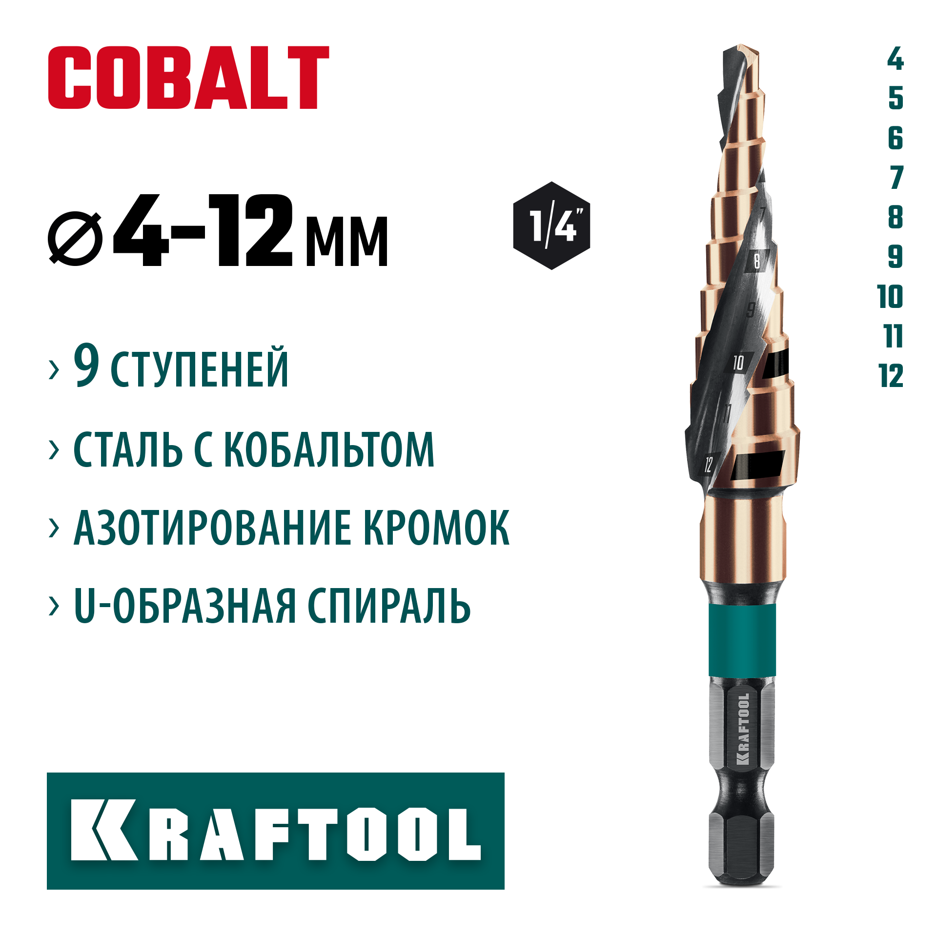 KRAFTOOL COBALT 4-12мм, 9 ступеней, азотирование, винтовая спираль, сверло ступенчатое(29691-4-12-9)