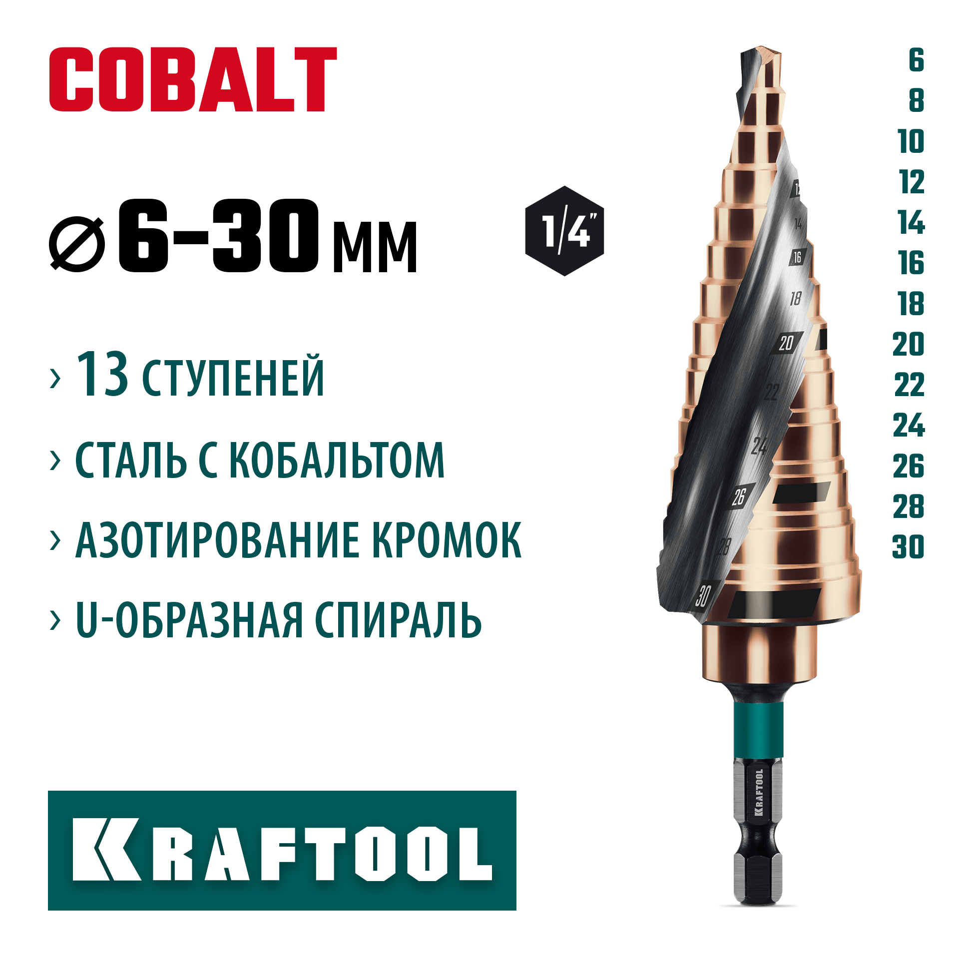 KRAFTOOL COBALT 6-30мм, 13 ступеней, азотирование, винтовая спираль, сверло ступенчатое(29691-6-30-13)