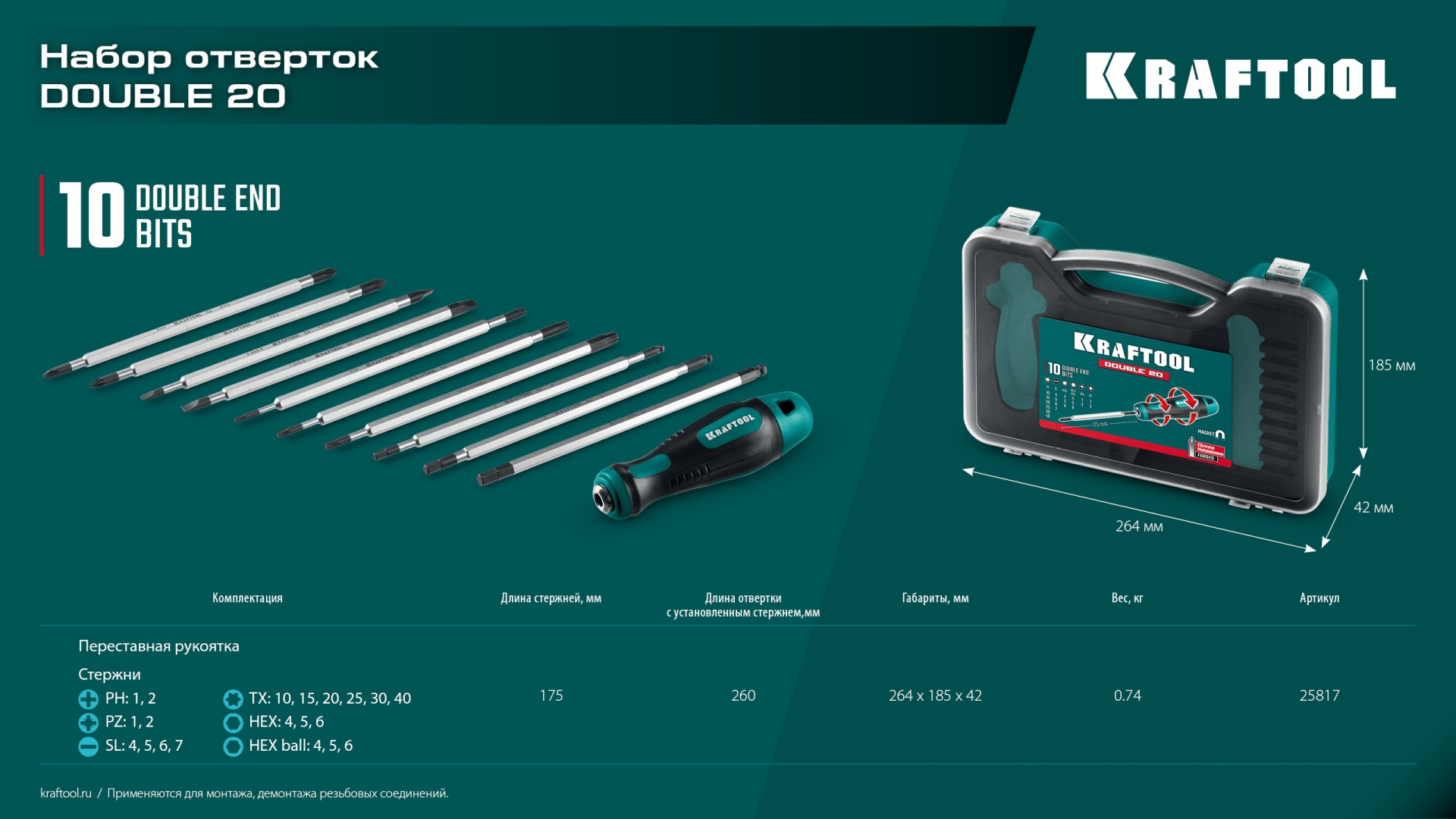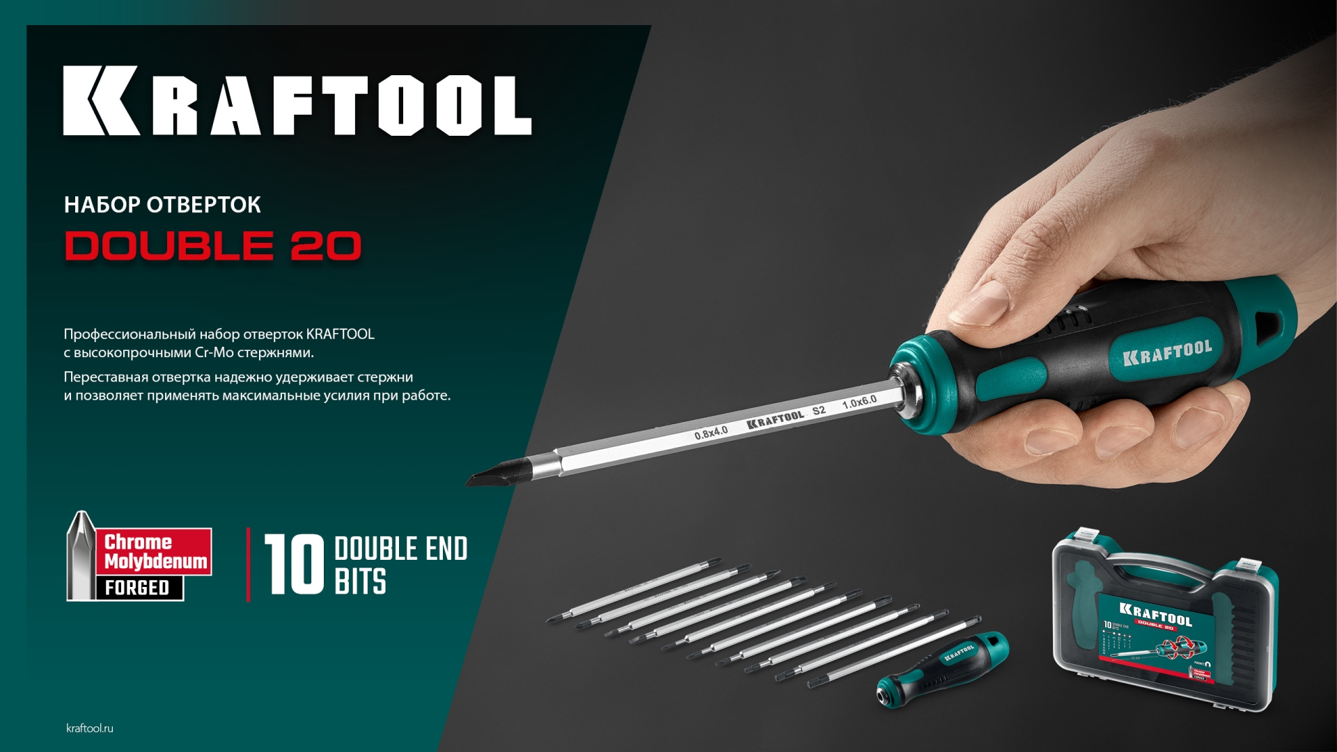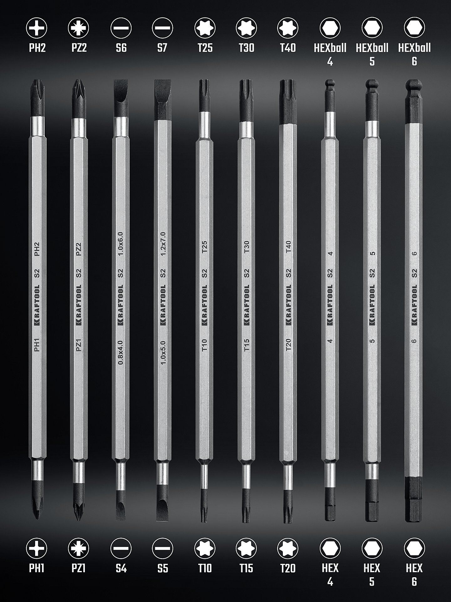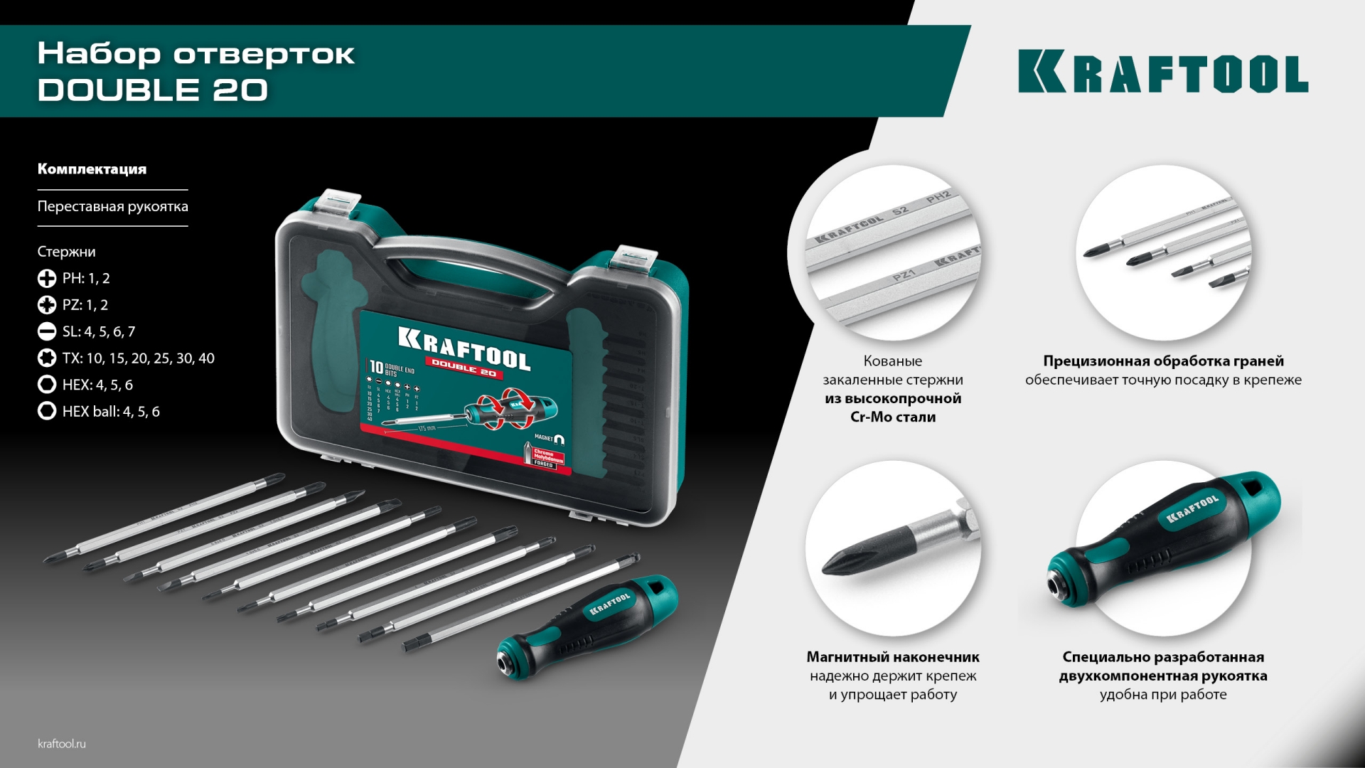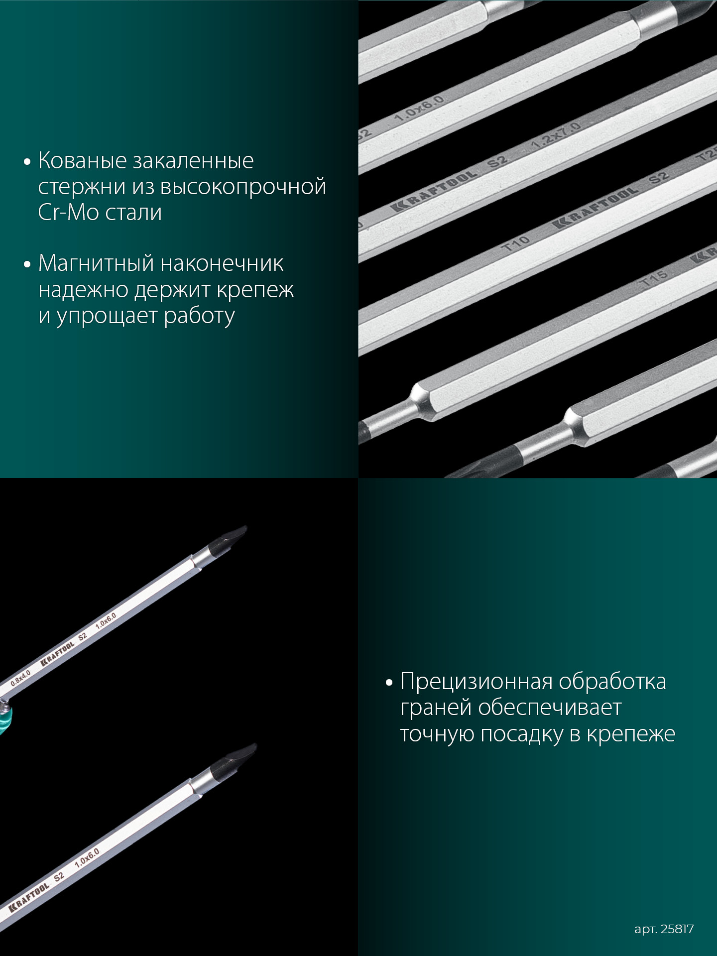 Профессиональный набор KRAFTOOL с высокопрочными Cr-Mo стержнями. Переставная отвертка надежно удерживает стержни и позволяет применять максимальные усилия при работе
