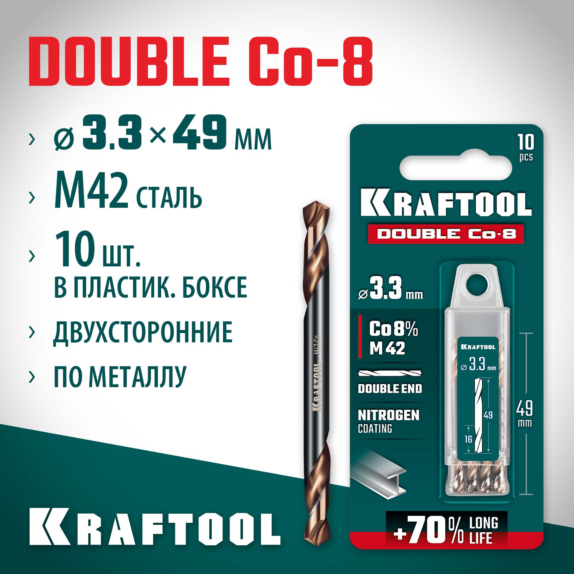 KRAFTOOL DOUBLE Сo-8 3.3х49мм, Сверло двухстороннее по металлу, сталь M42(+8%Co), класс А (29654-3.3-10)