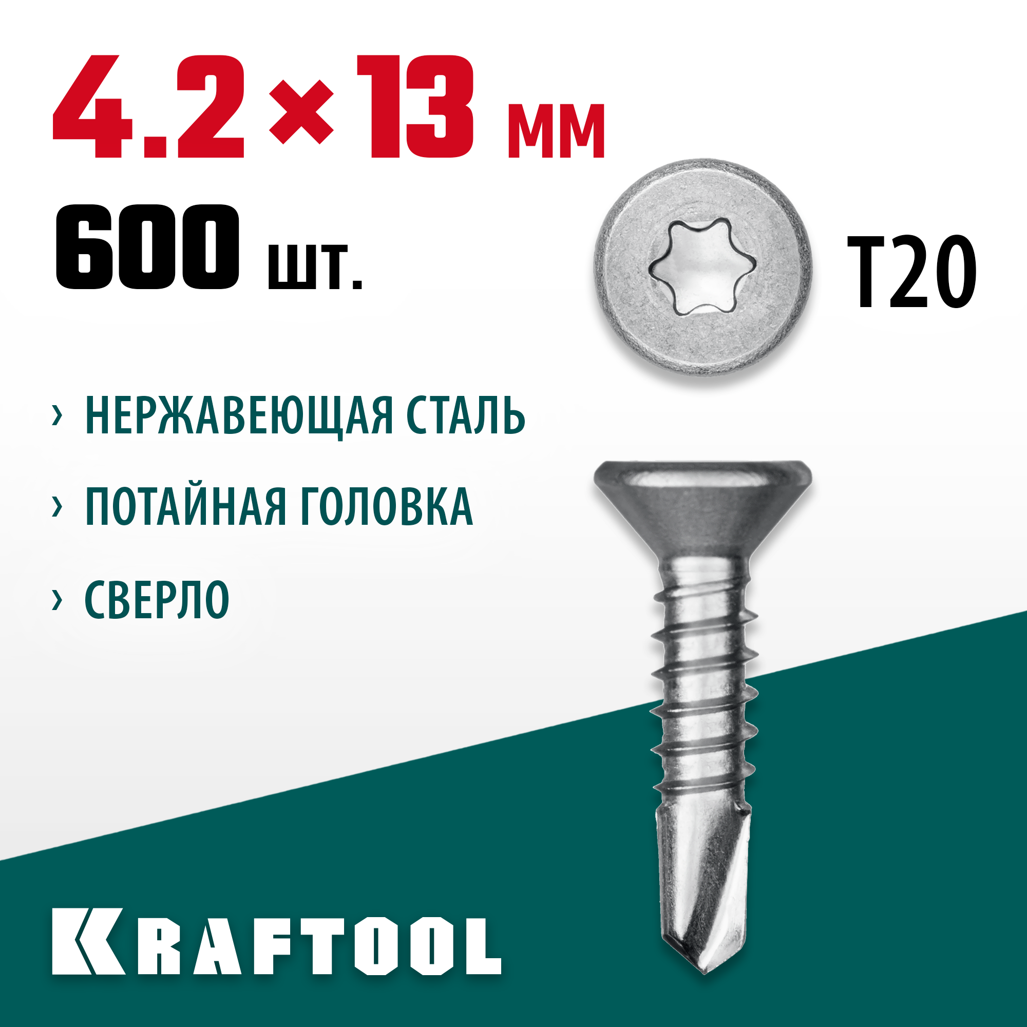 KRAFTOOL DS-C, 13 х 4.2 мм, А2, сверло, потайная головка, ТХ20, 600 шт, саморез нержавеющий (300932-42-013)