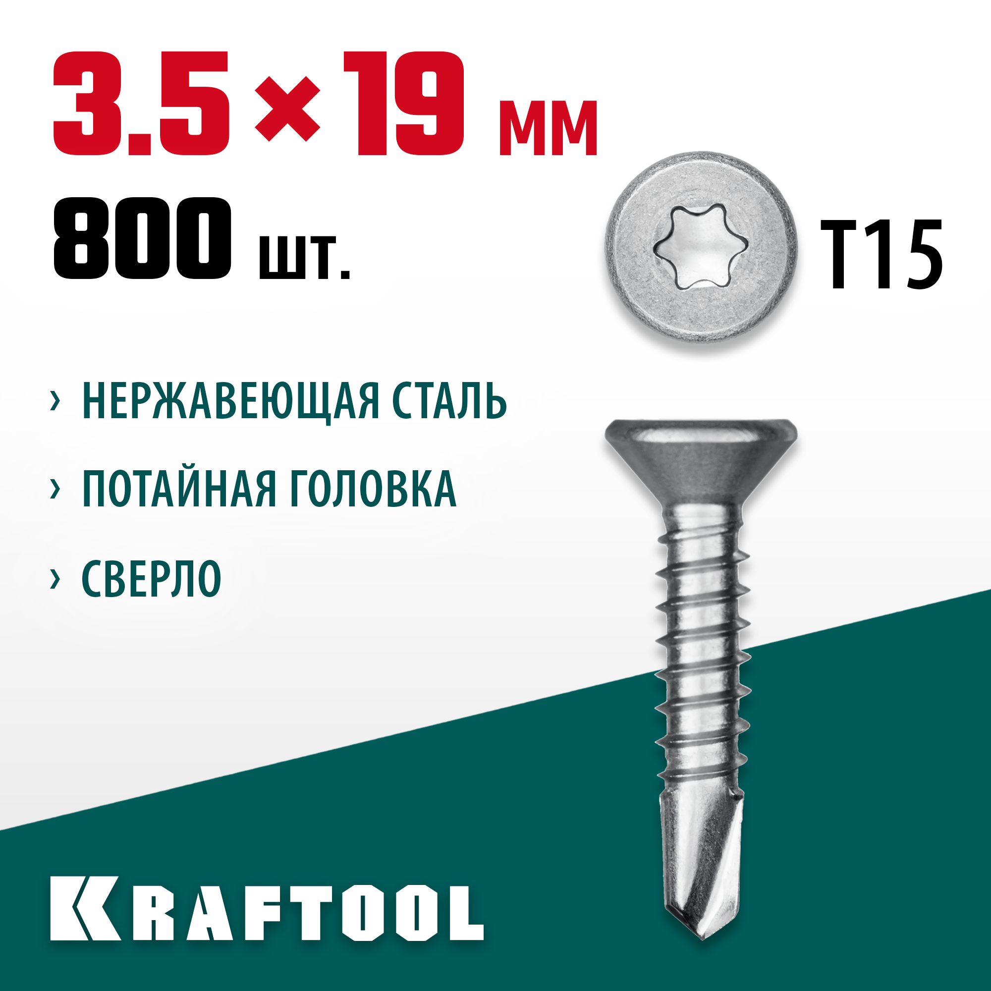 KRAFTOOL DS-C, 19 х 3.5 мм, А2, сверло, потайная головка, ТХ15, 800 шт, саморез нержавеющий (300932-35-019)