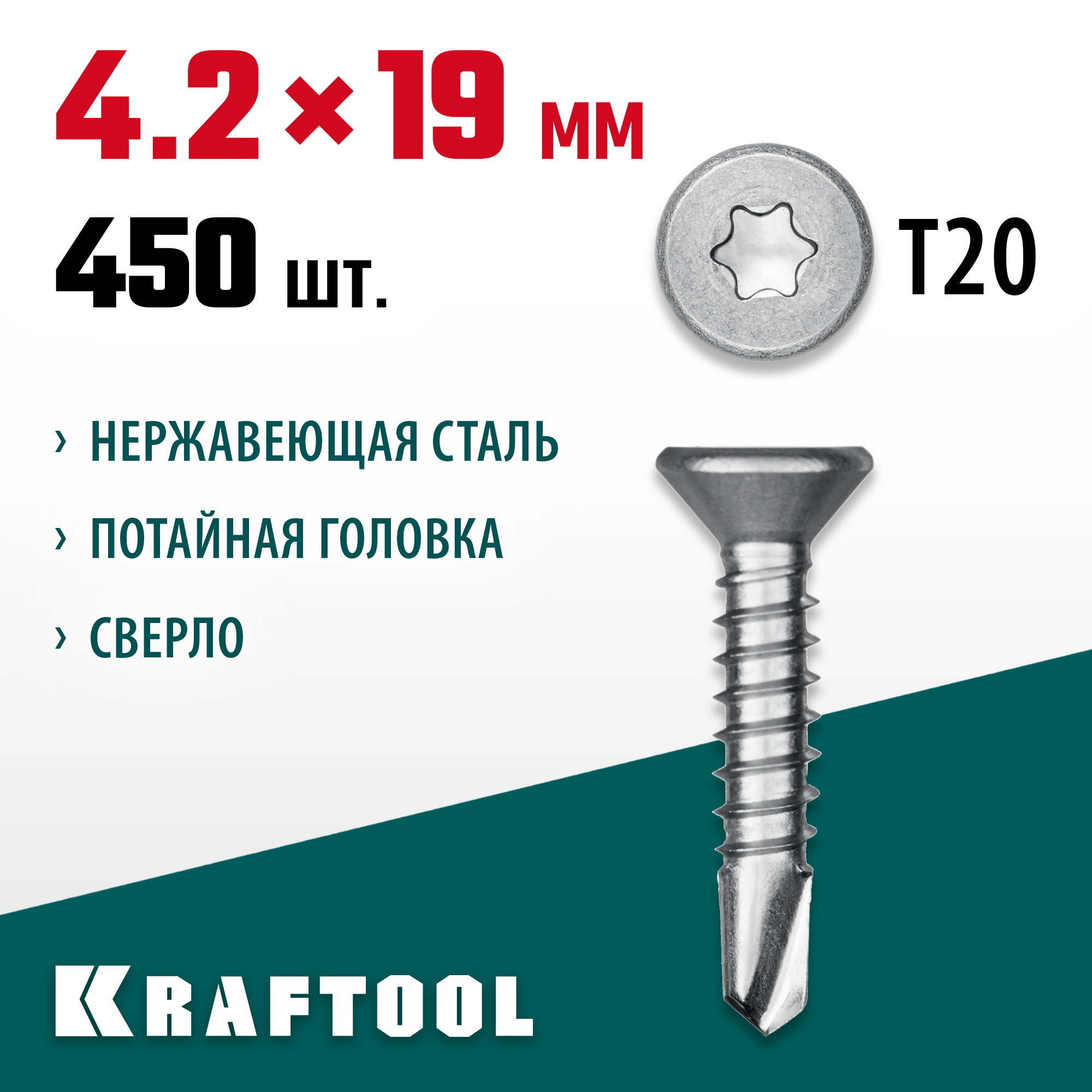 KRAFTOOL DS-C, 19 х 4.2 мм, А2, сверло, потайная головка, ТХ20, 450 шт, саморез нержавеющий (300932-42-019)