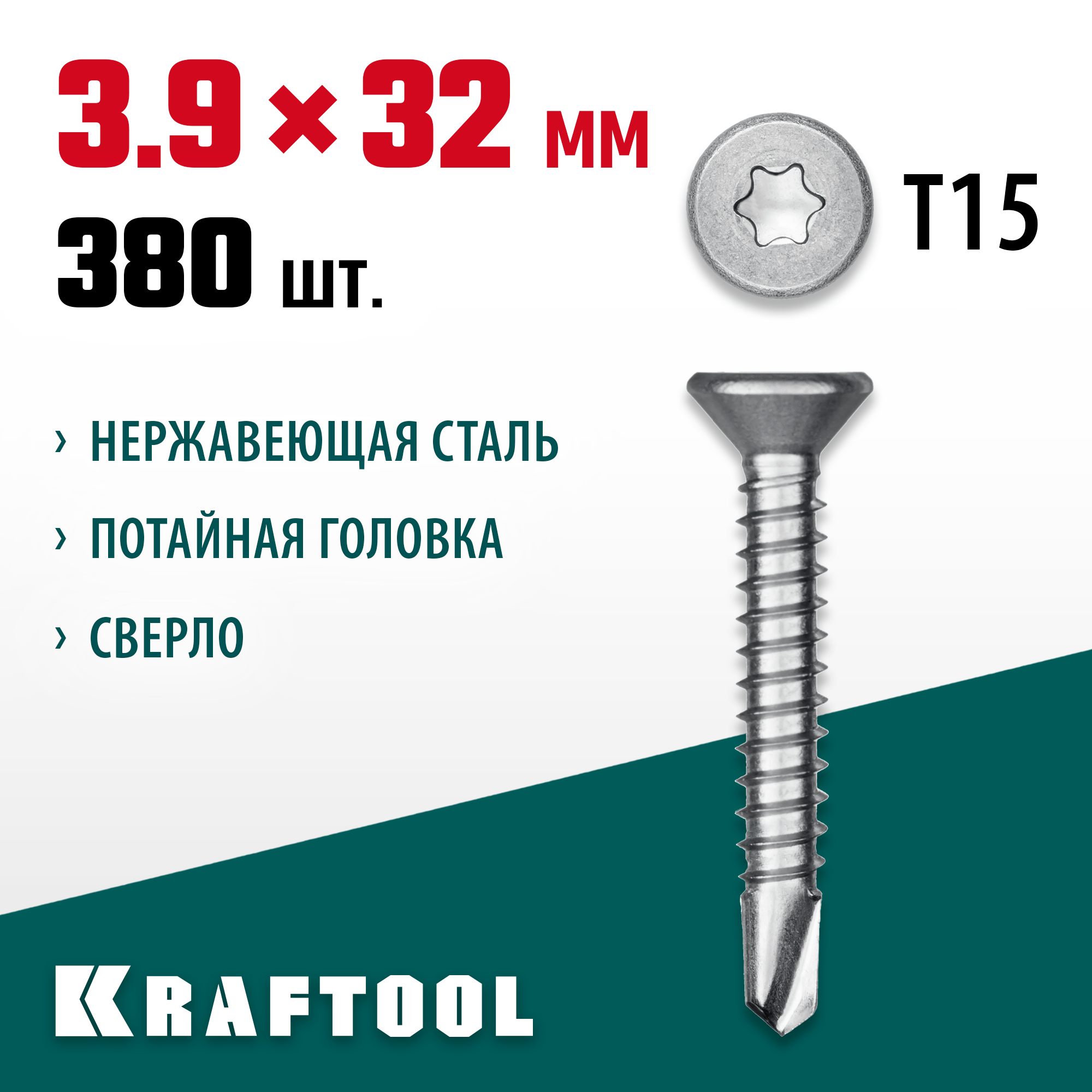KRAFTOOL DS-C, 32 х 3.9 мм, А2, сверло, потайная головка, ТХ15, 380 шт, саморез нержавеющий (300932-39-032)