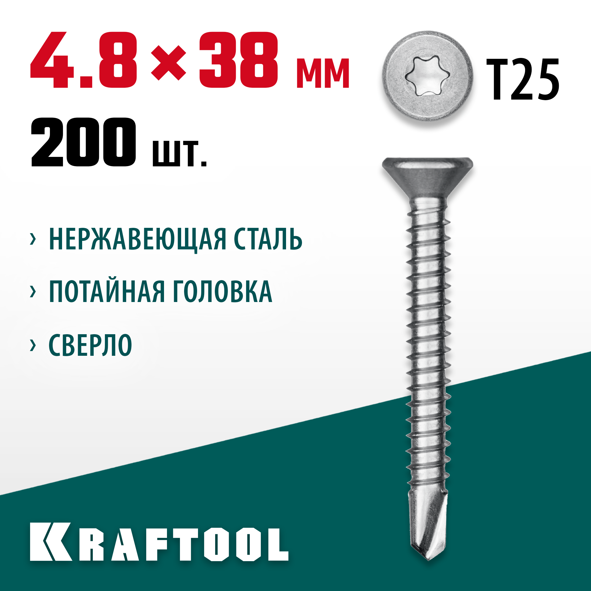 KRAFTOOL DS-C, 38 х 4.8 мм, А2, сверло, потайная головка, ТХ25, 200 шт, саморез нержавеющий (300932-48-038)