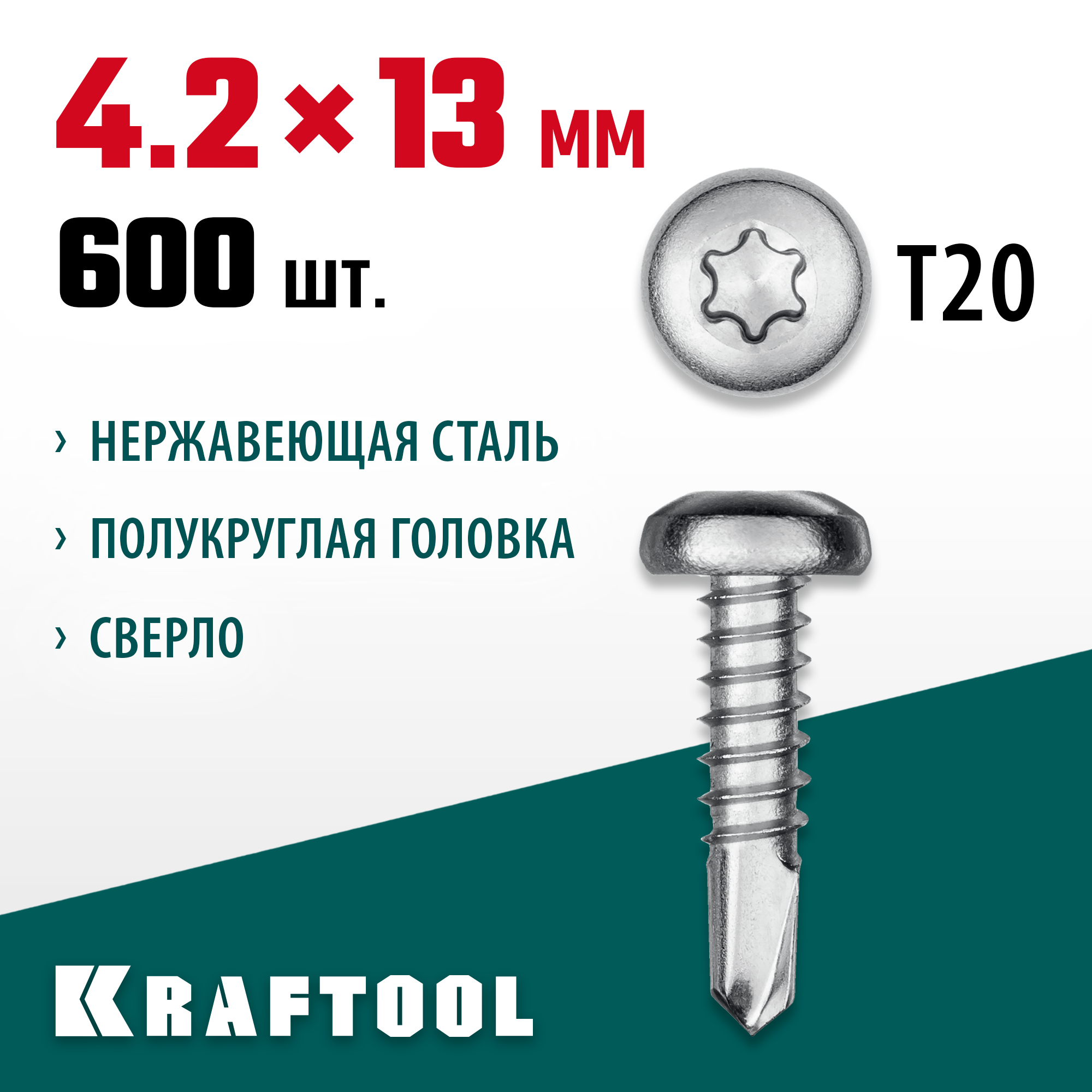 KRAFTOOL DS-P, 13 х 4.2 мм, А2, сверло, полукруглая головка, ТХ20, 600 шт, саморез нержавеющий (300931-42-013)