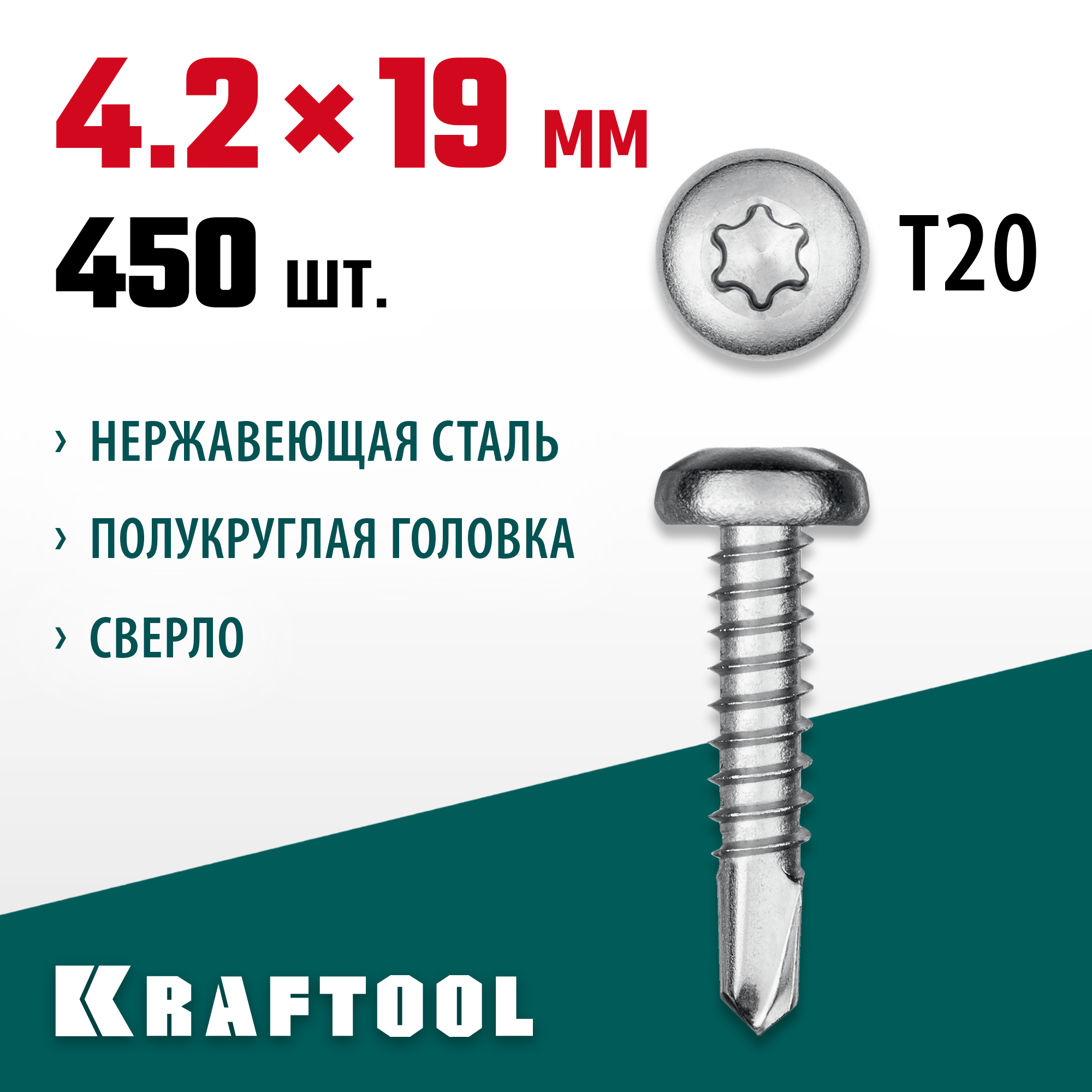 KRAFTOOL DS-P, 19 х 4.2 мм, А2, сверло, полукруглая головка, ТХ20, 450 шт, саморез нержавеющий (300931-42-019)