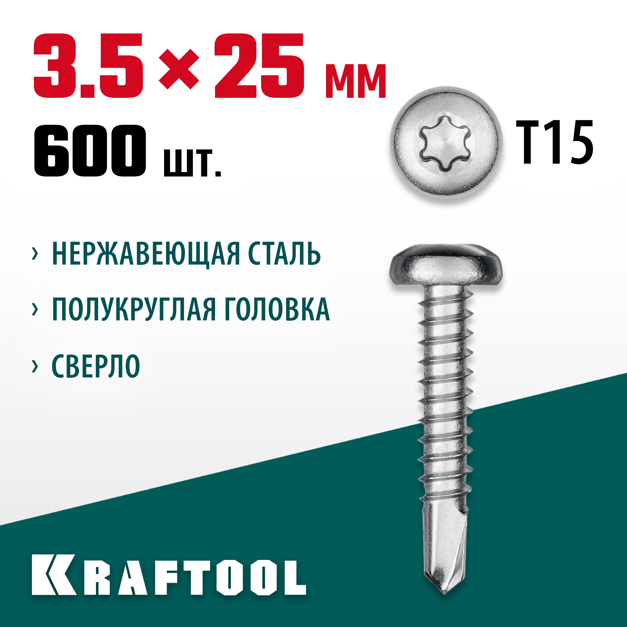 KRAFTOOL DS-P, 25 х 3.5 мм, А2, сверло, полукруглая головка, ТХ15, 600 шт, саморез нержавеющий (300931-35-025)