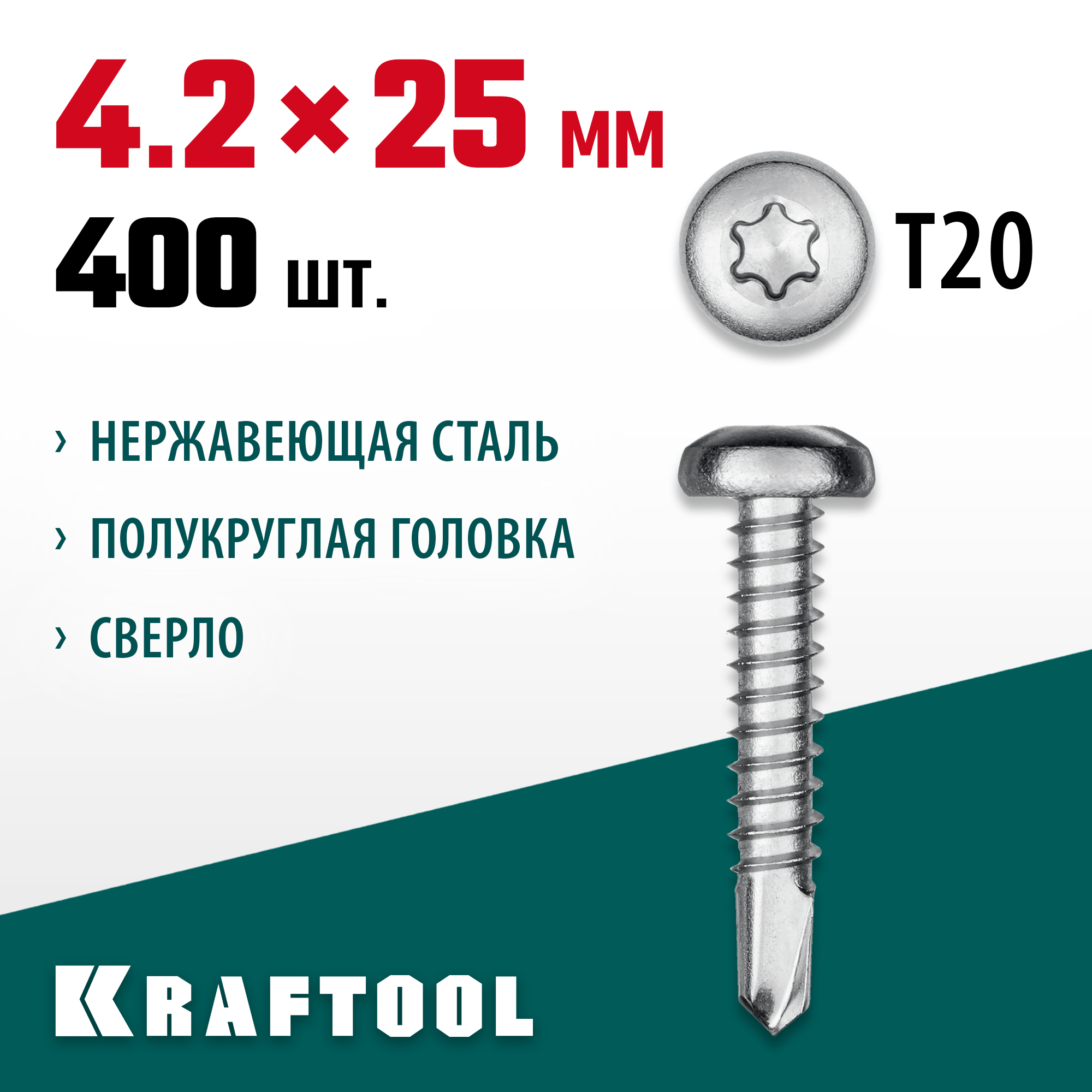 KRAFTOOL DS-P, 25 х 4.2 мм, А2, сверло, полукруглая головка, ТХ20, 400 шт, саморез нержавеющий (300931-42-025)