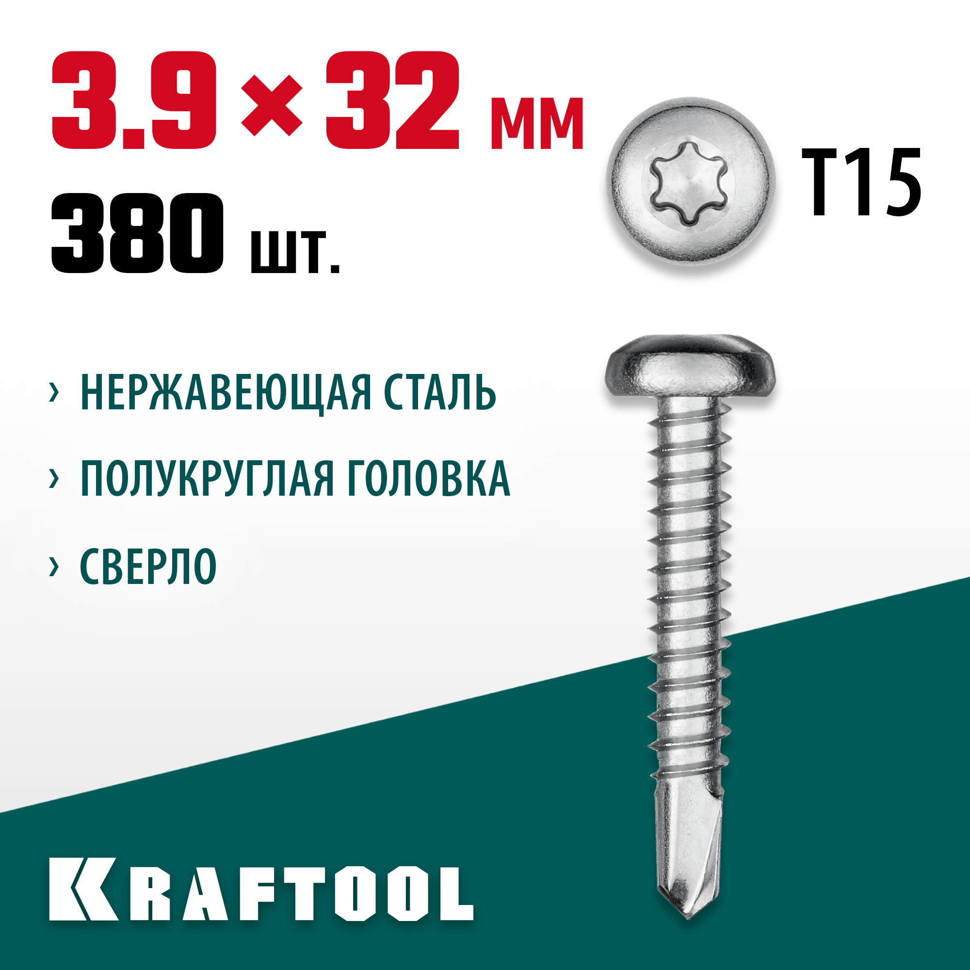 KRAFTOOL DS-P, 32 х 3.9 мм, А2, сверло, полукруглая головка, ТХ15, 380 шт, саморез нержавеющий (300931-39-032)