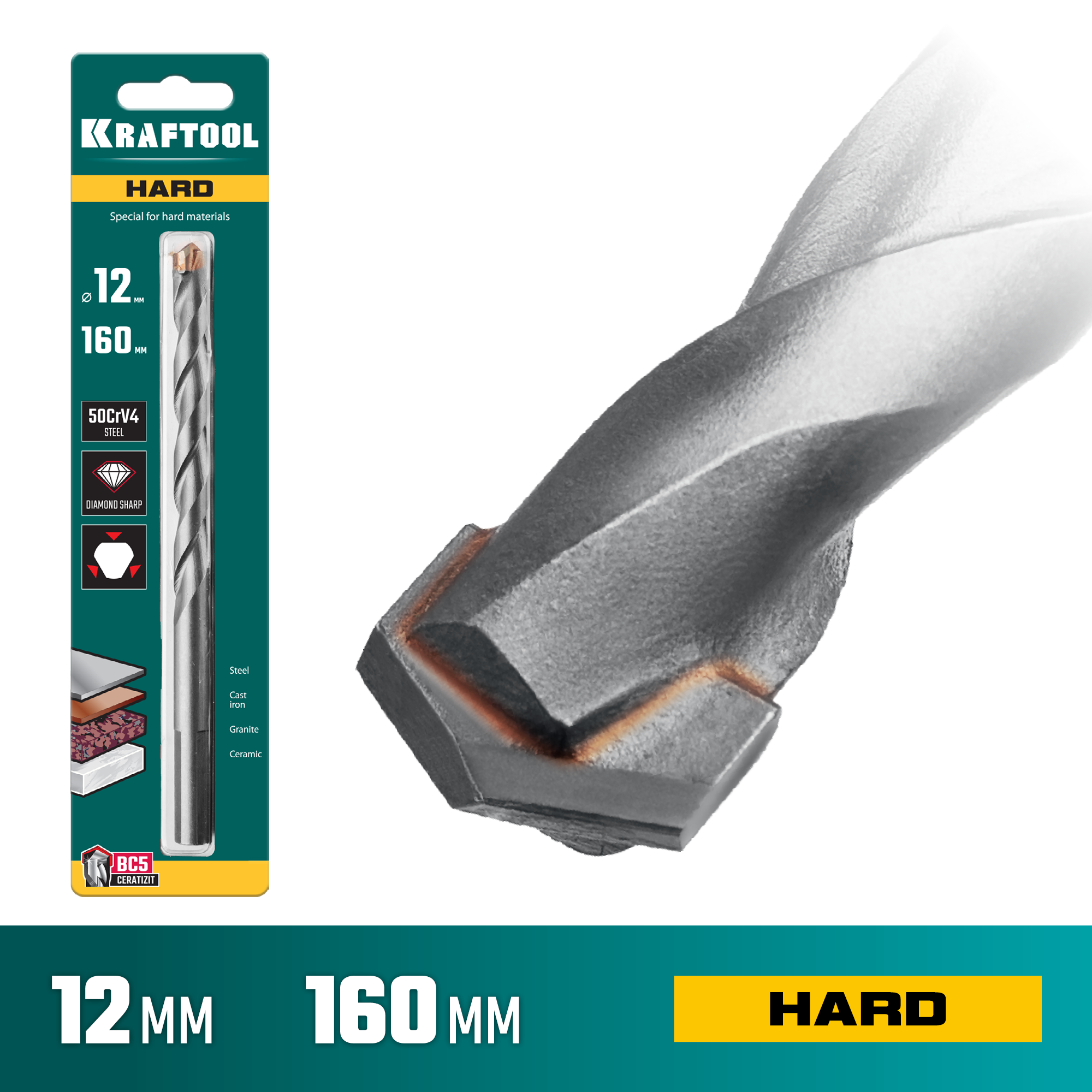 KRAFTOOL Hard, 12 х 160 мм, тв.сплав ВС5, сверло специальное по твёрдым материалам (29177-160-12)