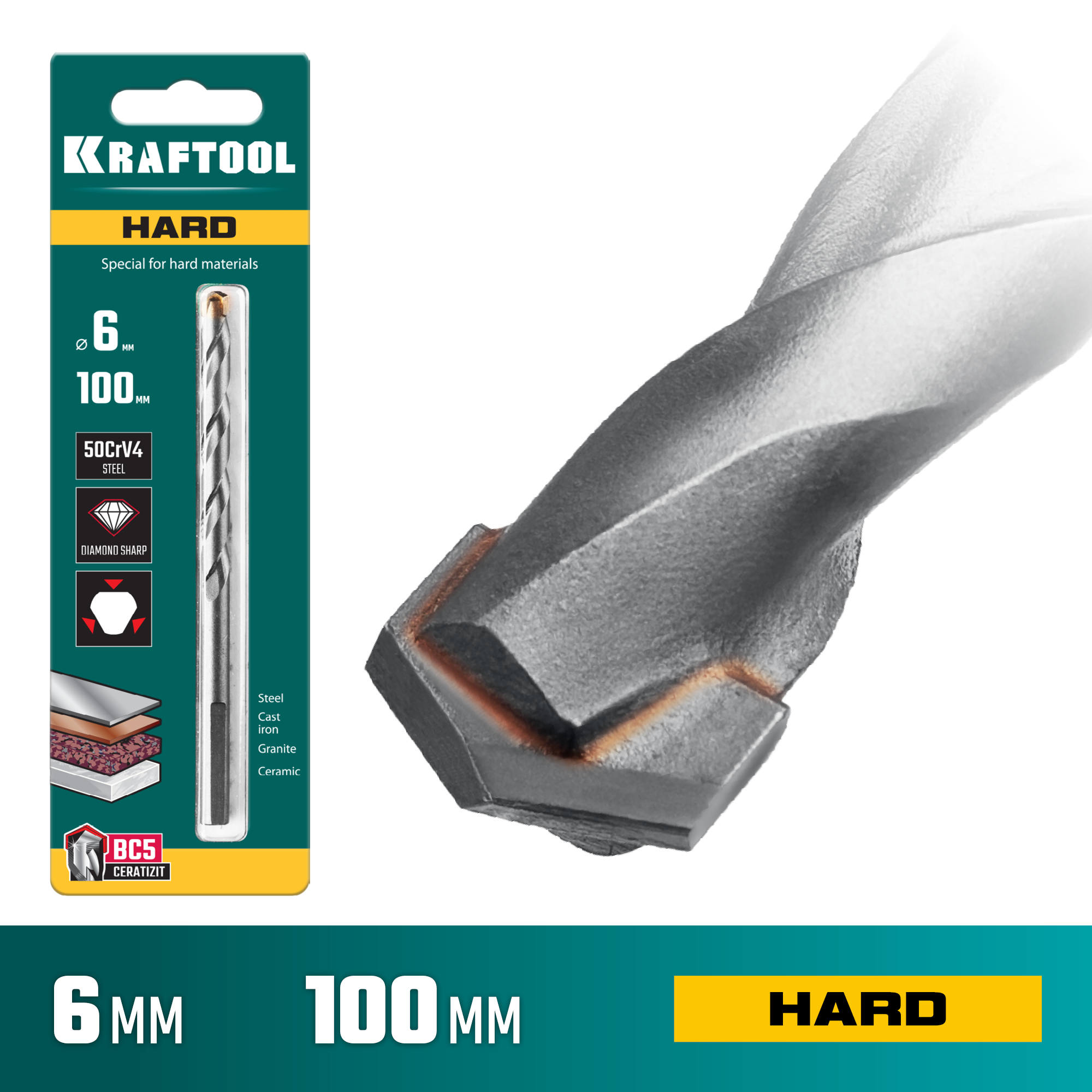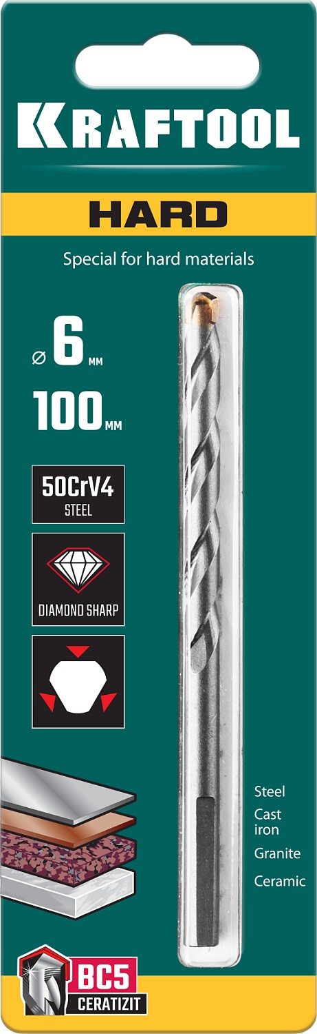 KRAFTOOL Hard, 6 х 100 мм, тв.сплав ВС5, сверло специальное по твёрдым материалам (29177-100-6)