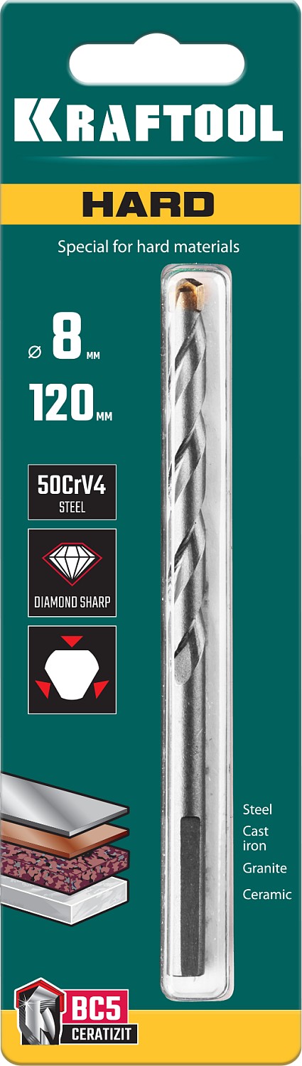 KRAFTOOL Hard, 8 х 120 мм, тв.сплав ВС5, сверло специальное по твёрдым материалам (29177-120-8)