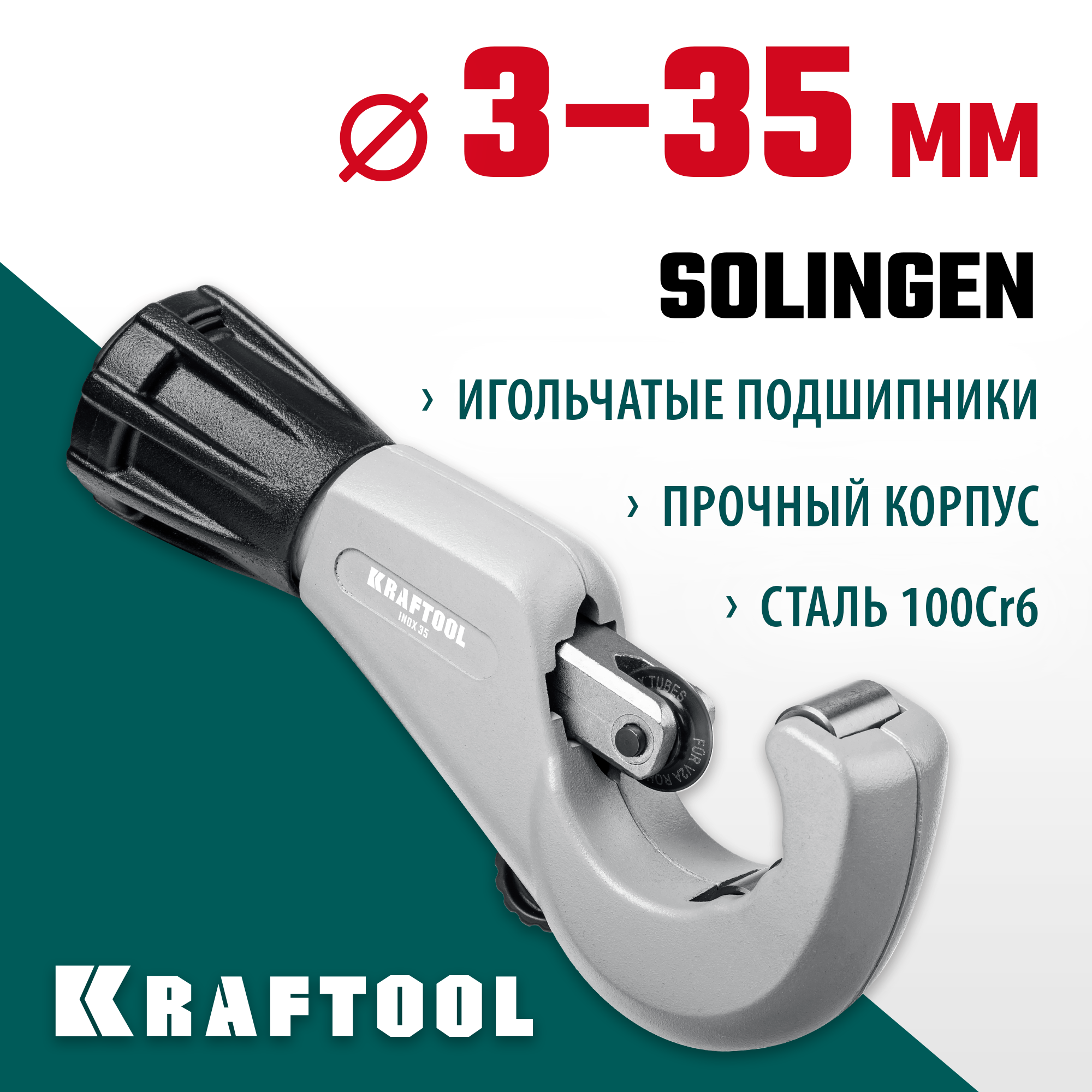 INOX профессиональный роликовый труборез на подшипниках: для нержавеющих, стальных, медных, алюминиевых, латунных, бронзовых труб с толщиной стенки до 2мм. Режущий ролик SOLINGEN made in GERMANY: сталь 100Cr6, закалка 67 HRC. Игольчатые подшипники в режущем и опорных роликах для легкого хода. Высокоточная система подачи ролика для идеально точного реза. Быстрая замена ролика без инструментов. Металлический корпус