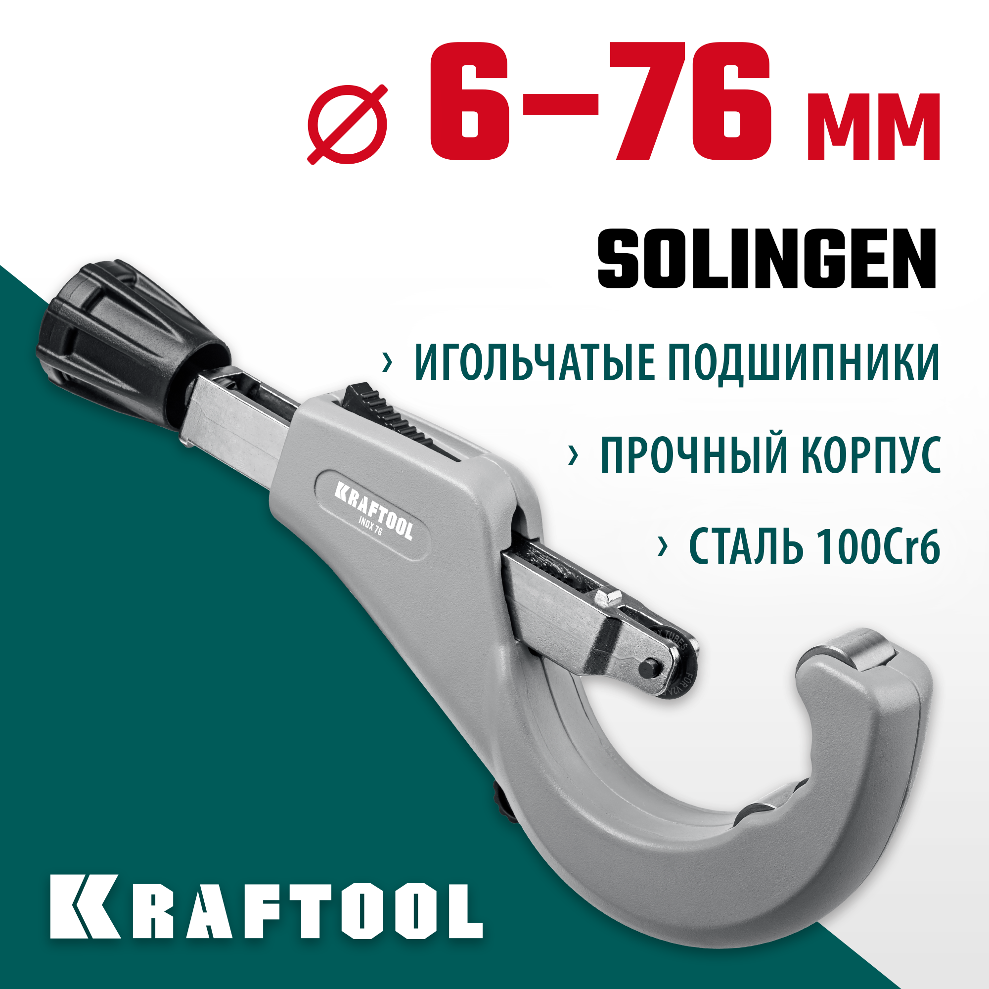 INOX профессиональный роликовый труборез на подшипниках: для нержавеющих, стальных, медных, алюминиевых, латунных, бронзовых труб с толщиной стенки до 2мм. Режущий ролик SOLINGEN made in GERMANY: сталь 100Cr6, закалка 67 HRC. Игольчатые подшипники в режущем и опорных роликах для легкого хода. Высокоточная система подачи ролика для идеально точного реза. Быстрая замена ролика без инструментов. Металлический корпус