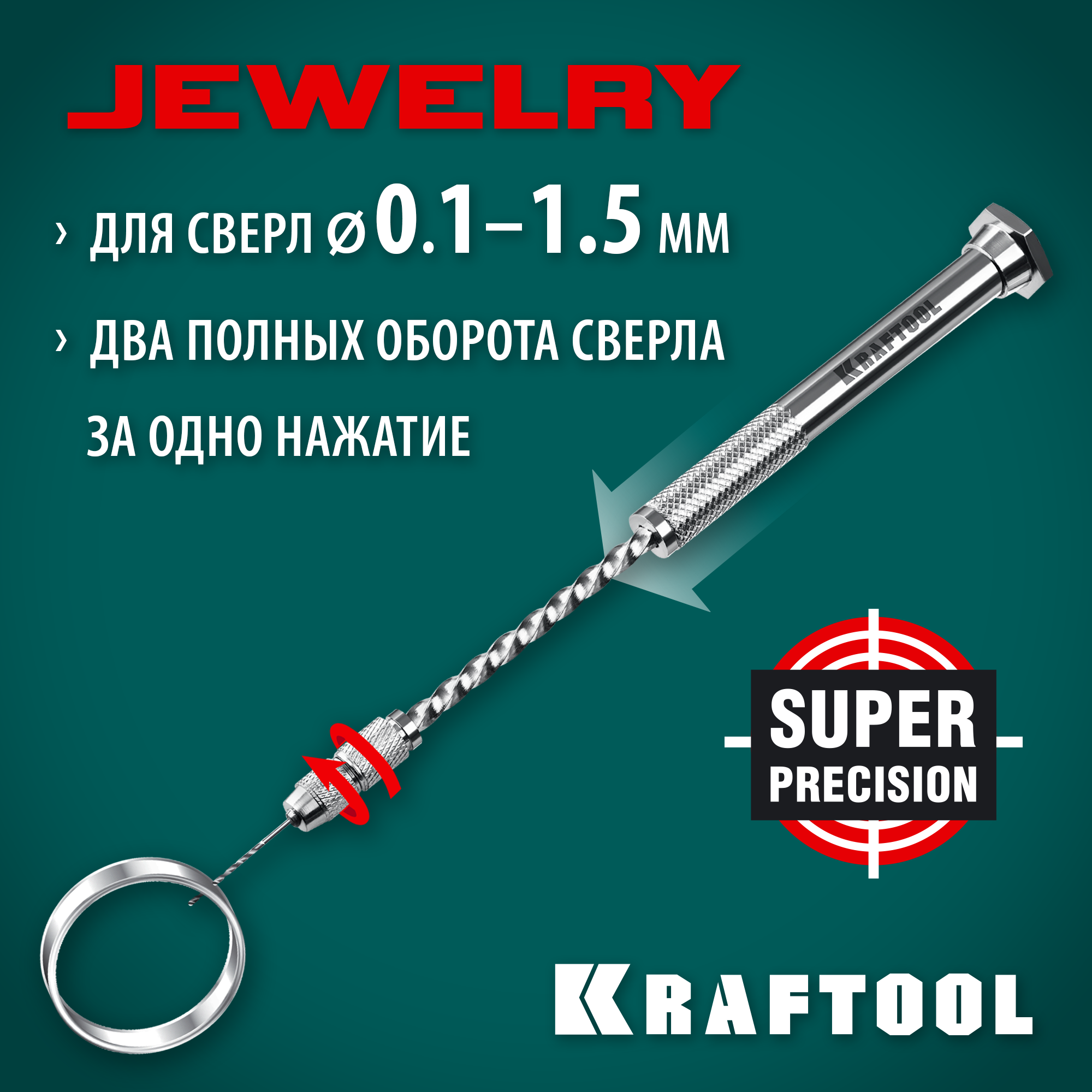 Профессиональная механическая ручная дрель KRAFTOOL Precision для особоточных ювелирных и электронных работ. Механизм вращения из закаленной стали. Корпус из хромированной латуни. Два стальных четырёхлепестковых зажима в комплекте. Для свёрл Ø 0,1-1,5 мм. Два полных оборота сверла за одно нажатие. Большой ресурс. Простота в использовании. Незаменимый помощник для работ требующих повышенной аккуратности.