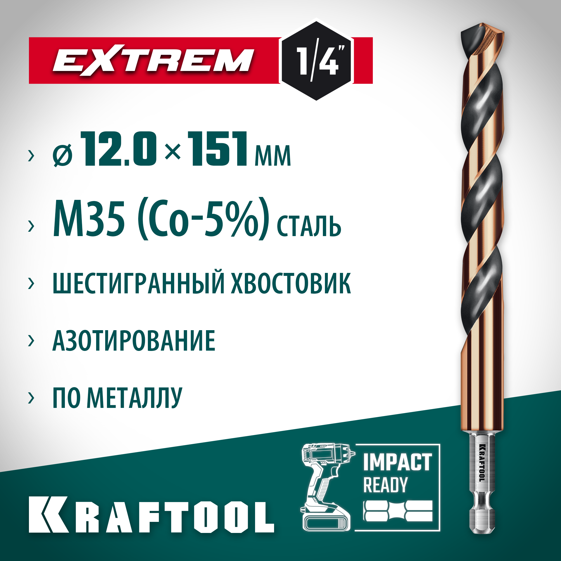 KRAFTOOL НЕХ-1/4″, d 12.0 х 151 мм, сверло по металлу для винтовёртов и шуруповертов IMPACT READY (29652-12)