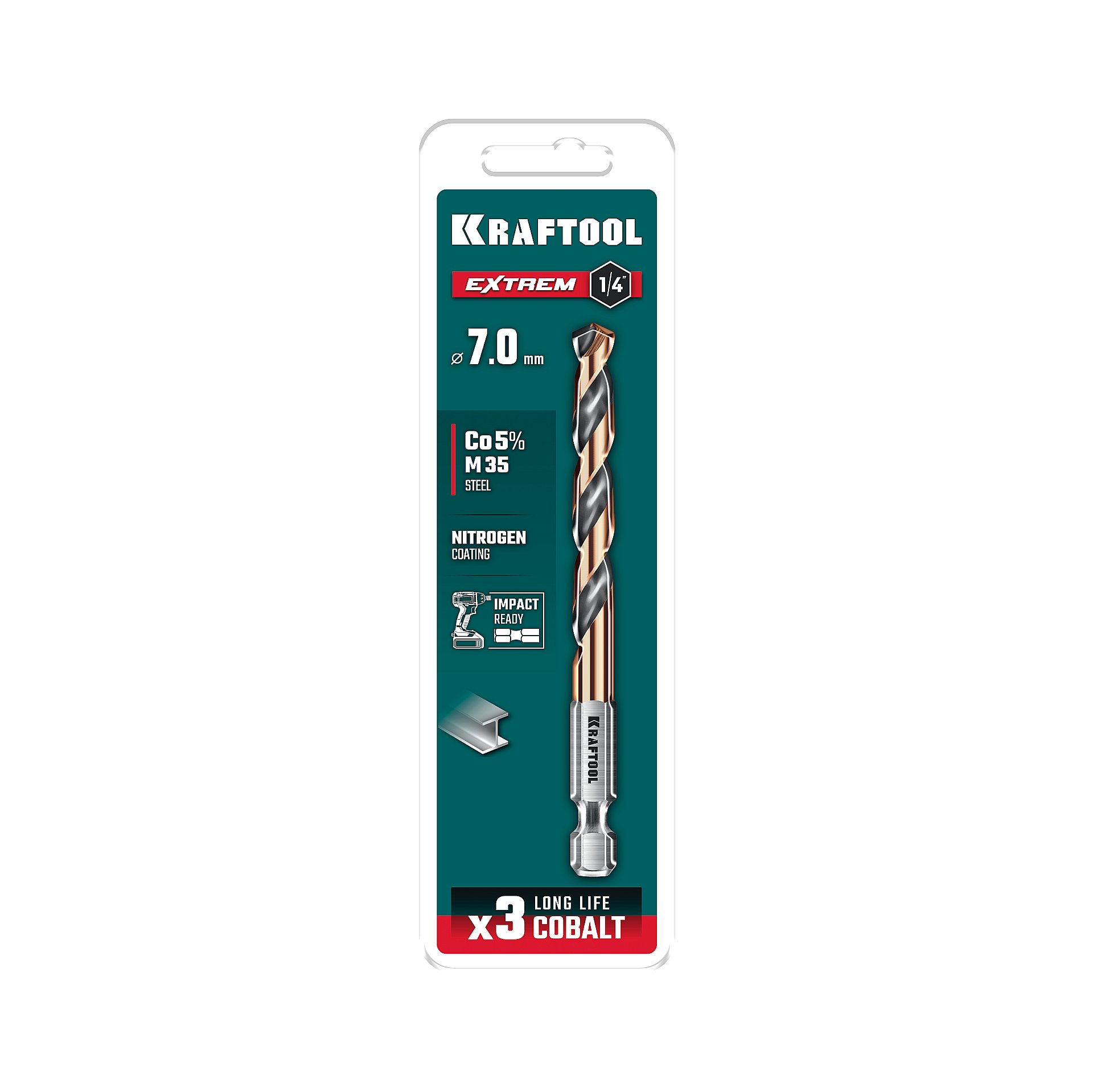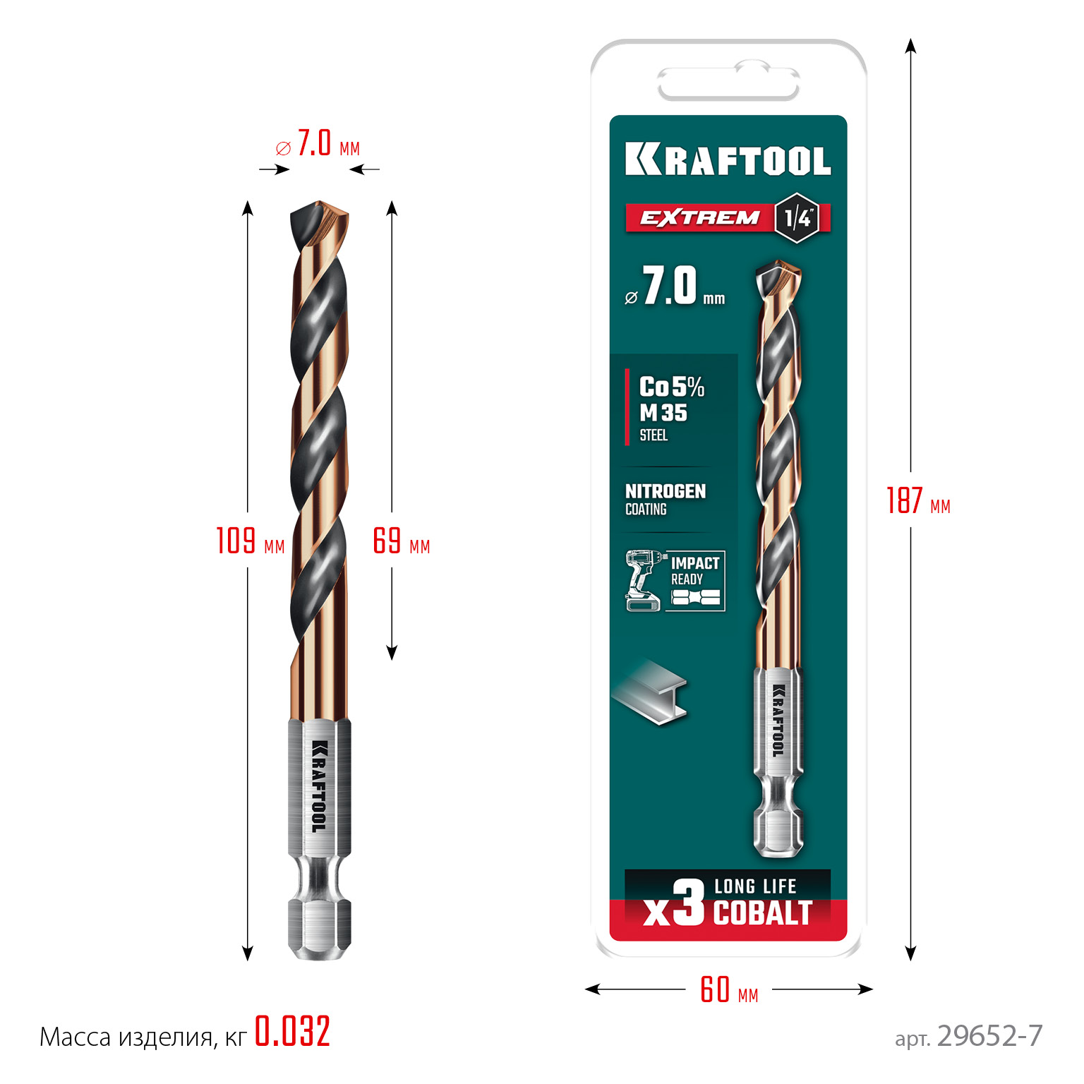 KRAFTOOL НЕХ-1/4″, d 7.0 х 109 мм, сверло по металлу для винтовёртов и шуруповертов IMPACT READY (29652-7)