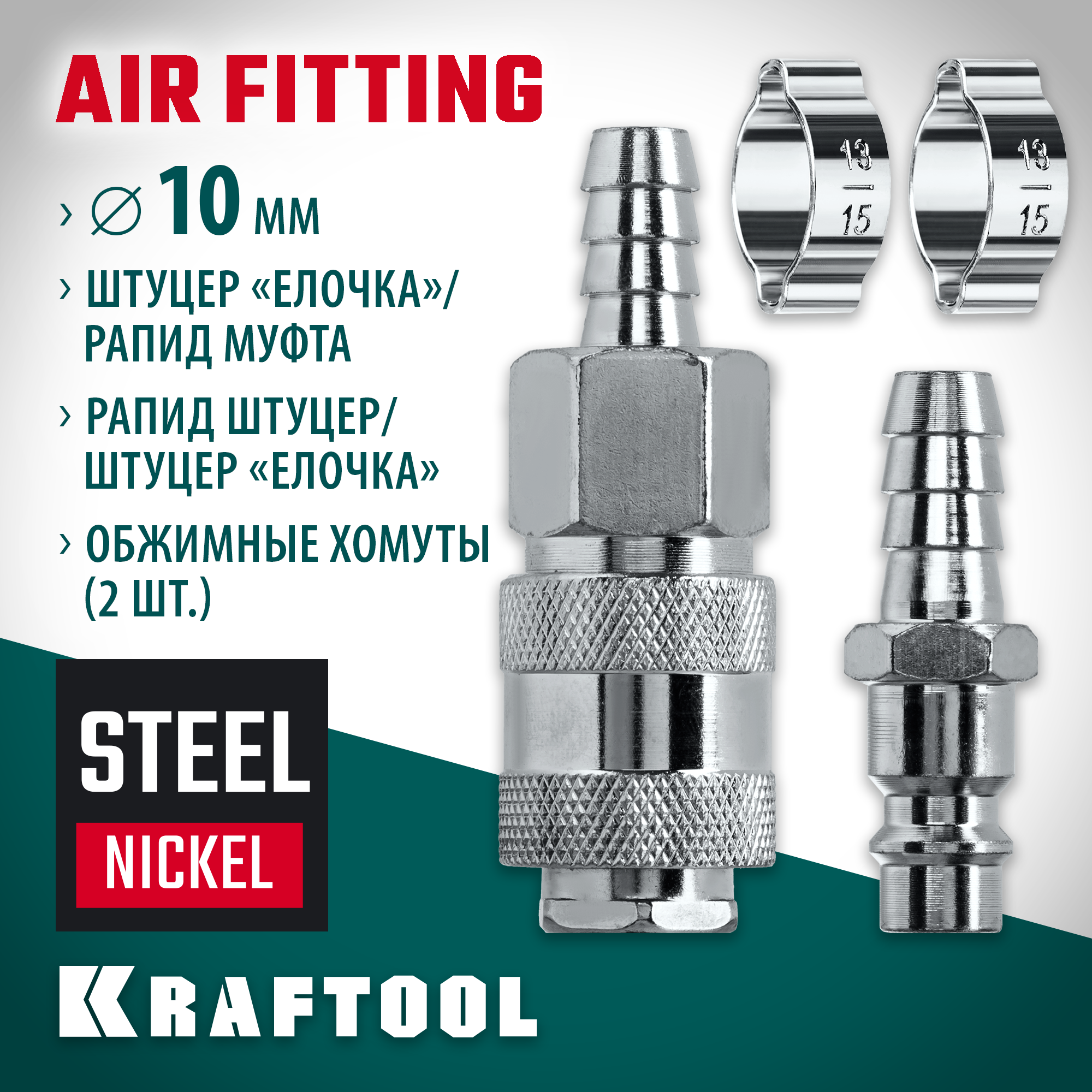KRAFTOOL (штуцер ″елочка″, 10 мм - рапид муфта) + (рапид штуцер-штуцер ″елочка″, 10 мм) + (обжимные хомуты 2 шт), набор (06599-10-H)