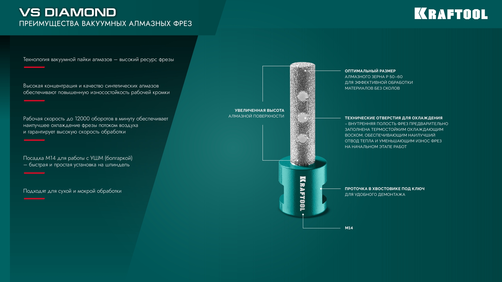 Профессиональные алмазные фрезы Kraftool произведены по технологии высокотемпературной вакуумной спайки алмазов, что обеспечивает высокую скорость обработки и большой ресурс.