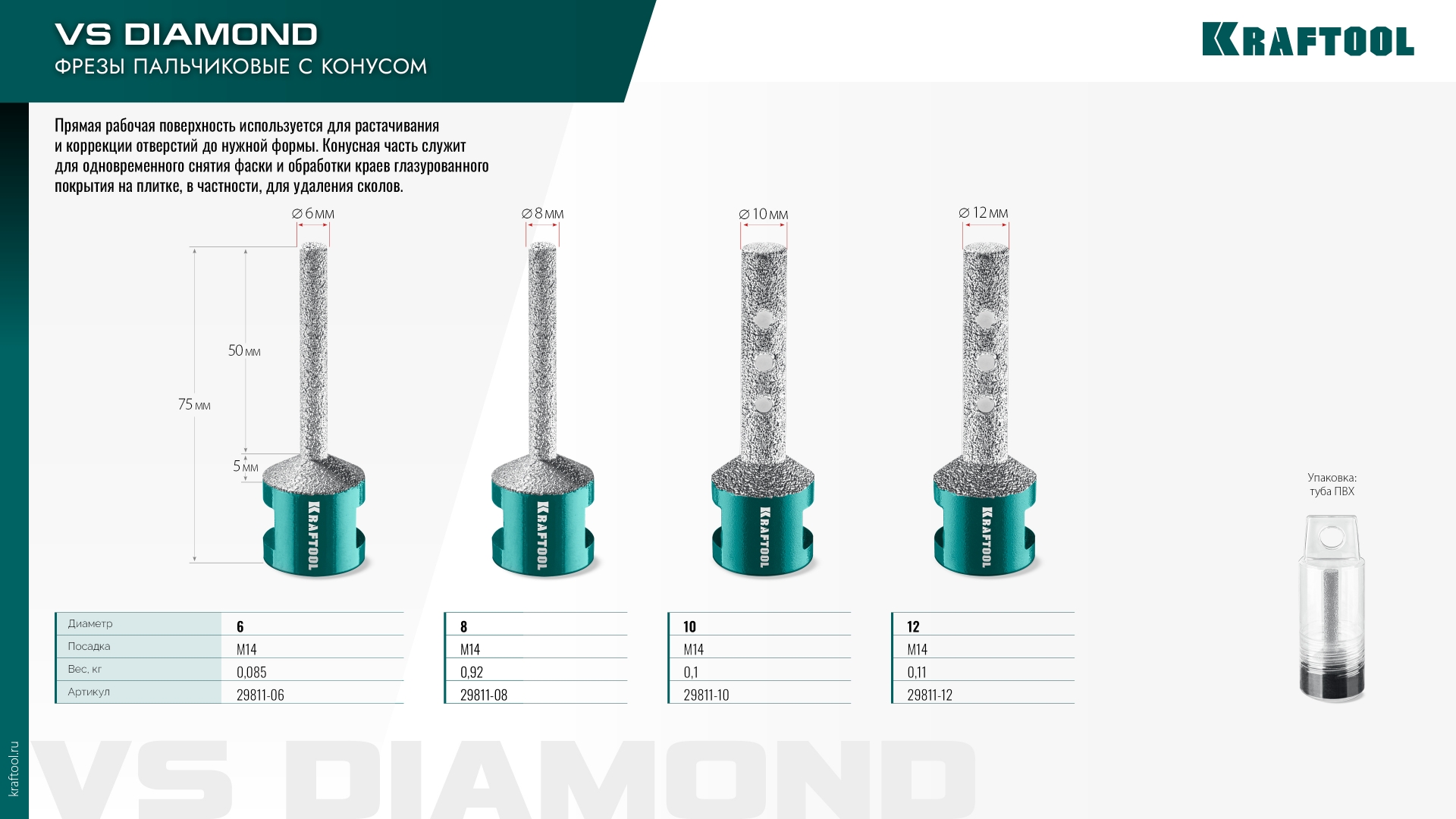 KRAFTOOL VS DIAMOND d 8 мм (М14, 50 мм), Вакуумная алмазная фреза пальчиковая с конусом (29811-08)