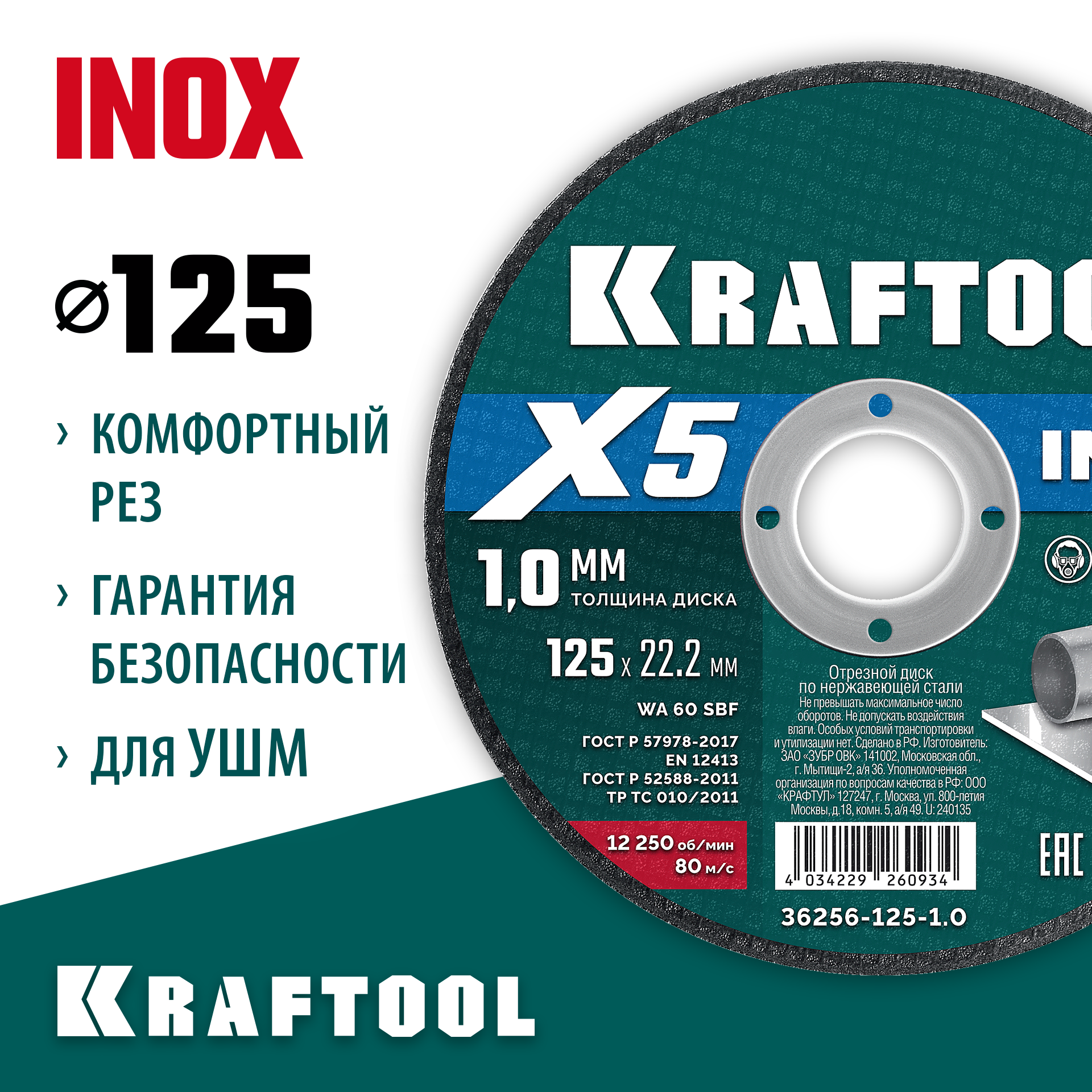 KRAFTOOL X5 INOX 125x1.0 мм по нерж. стали отрезной диск для УШМ (36256-125-1.0)