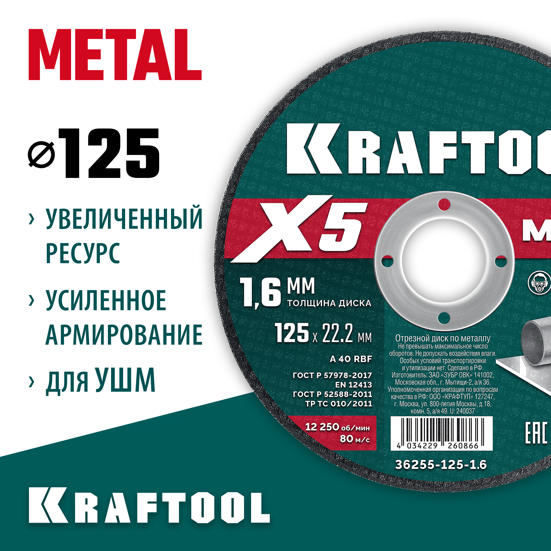 KRAFTOOL X5 Metal 125x1.6 мм по металлу отрезной диск для УШМ (36255-125-1.6)