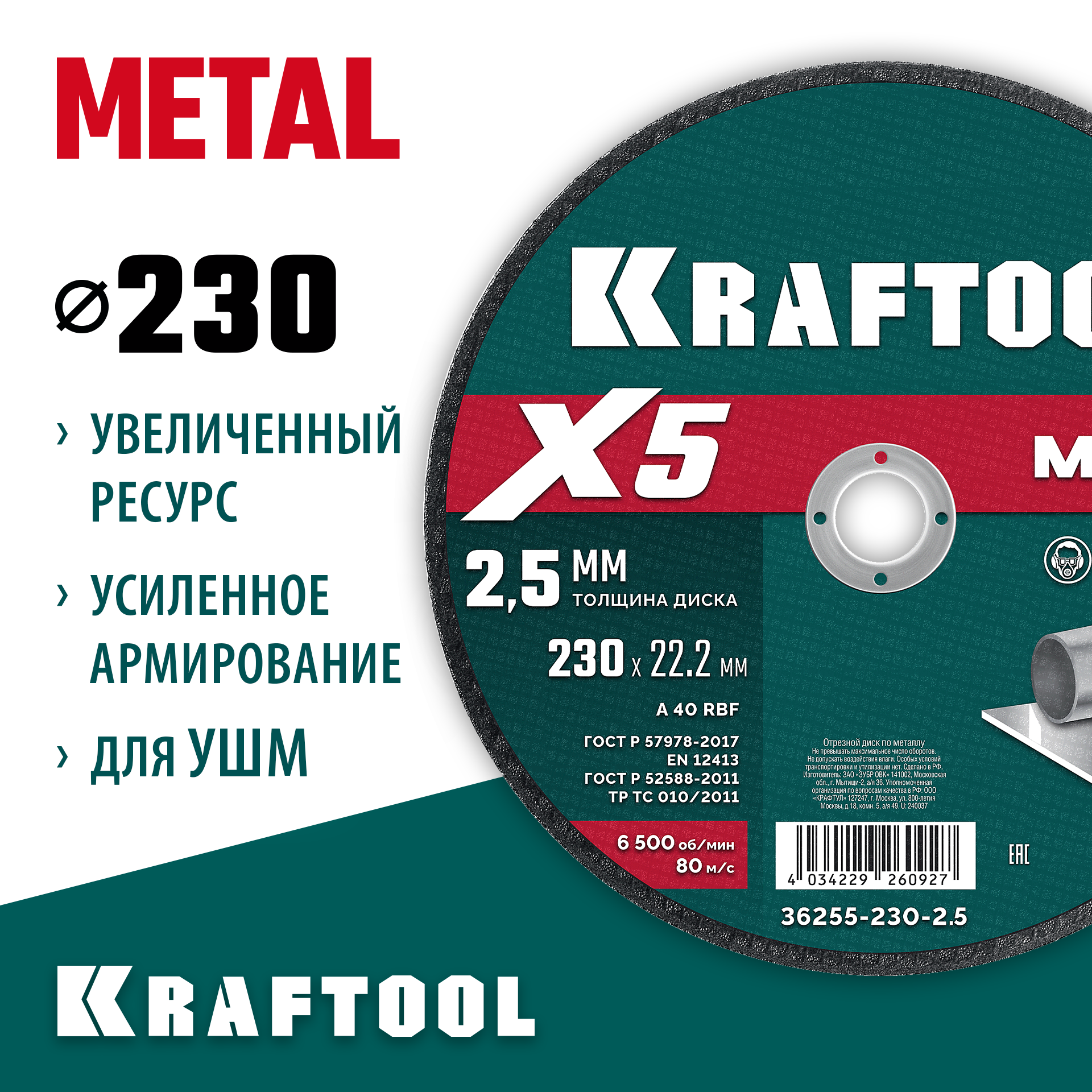 KRAFTOOL X5 Metal 230x2.5 мм по металлу отрезной диск для УШМ (36255-230-2.5)
