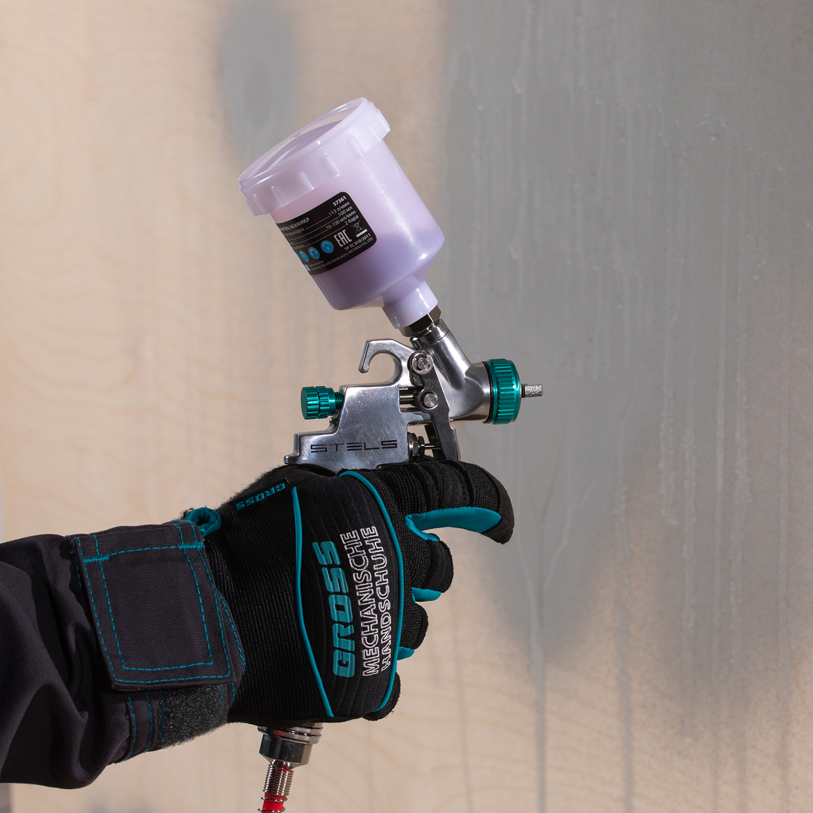 Продуманная конструкция — бачок с верхним расположением вмещает 100 мл краски или лака, благодаря чему гравитационный краскораспылитель становится мобильным и легко готовится к работе, ведь не нужно подключать его к большим красконагнетательным емкостям.
