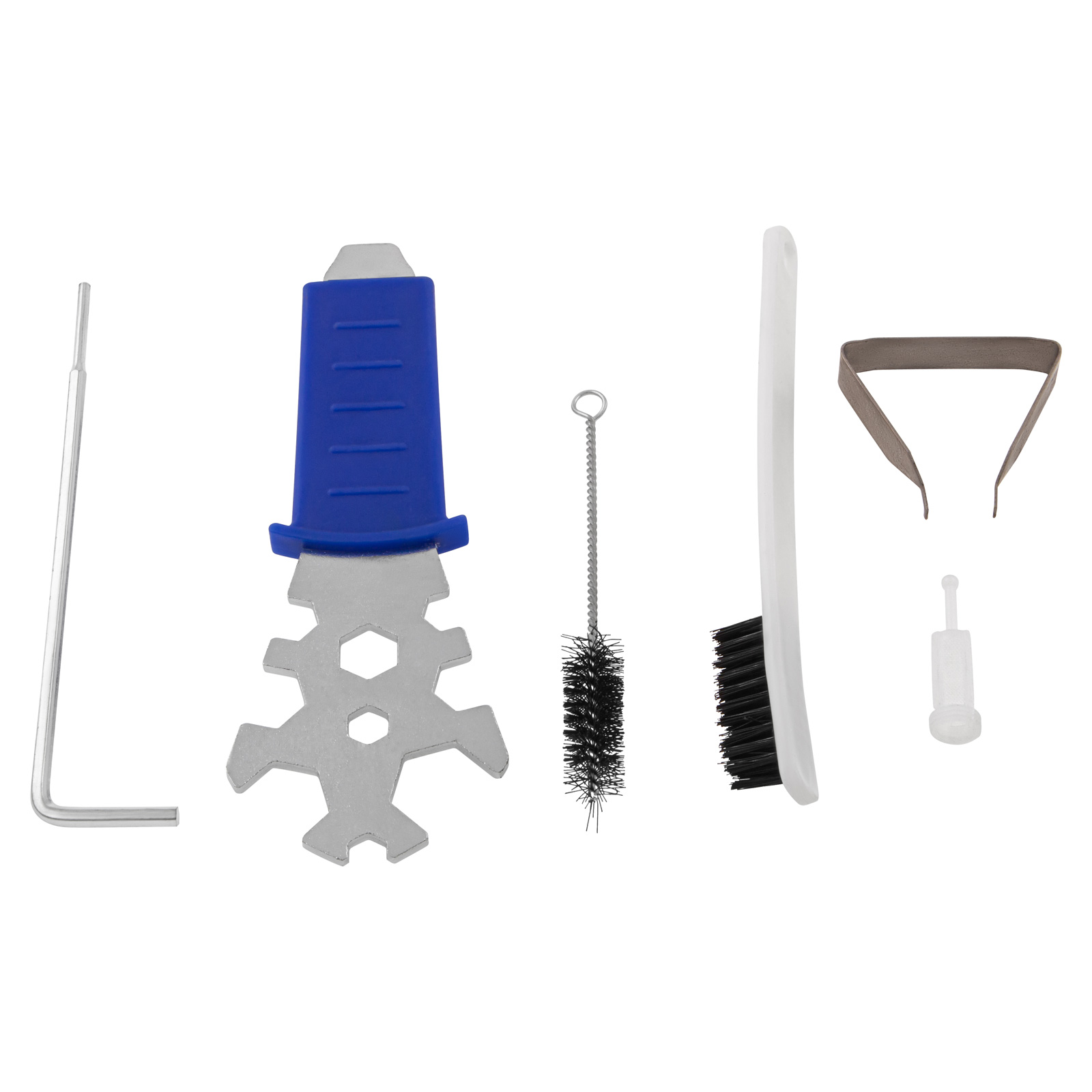 Необходимые аксессуары в комплекте — краскопульт поставляется с дюзовым набором диаметром 1,3 мм, ершиком для очистки и универсальным ключом.