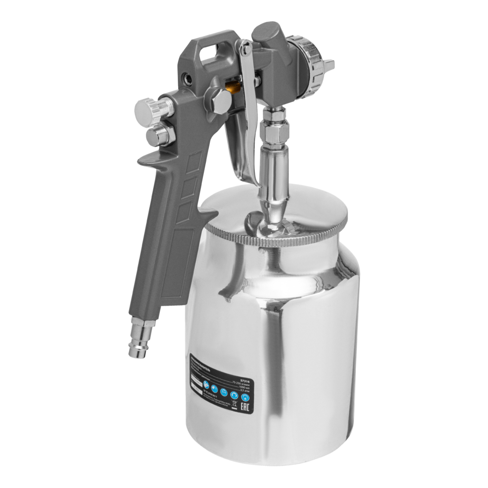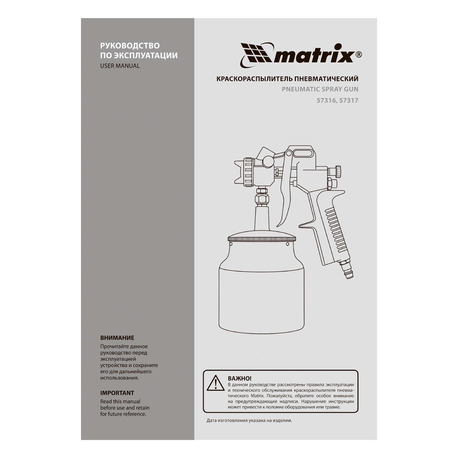 Пневматический краскораспылитель Matrix 57316 с нижним бачком объемом 1,0 л и соплами диаметром 1,2, 1,5 и 1,8 мм используется для окрашивания металлических, деревянных, керамических и пластмассовых поверхностей. Благодаря сменным соплам краскораспылитель может работать с различными по густоте составами: лаком, шпаклевкой, краской. Он пригодится на стройке, в автомастерской и на мебельном производстве.