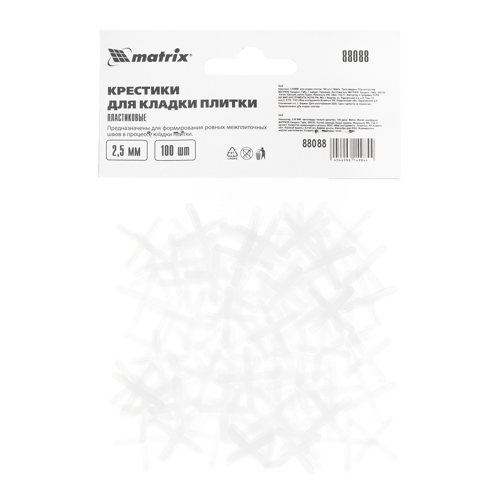 Крестики для кладки плитки Matrix 88088 толщиной 2,5 мм, 100 шт. в упаковке, используются для облицовки стен или пола и позволяют создать идеально ровные межплиточные швы. При помощи крестиков можно получить облицовочное покрытие высокой эстетической привлекательности.