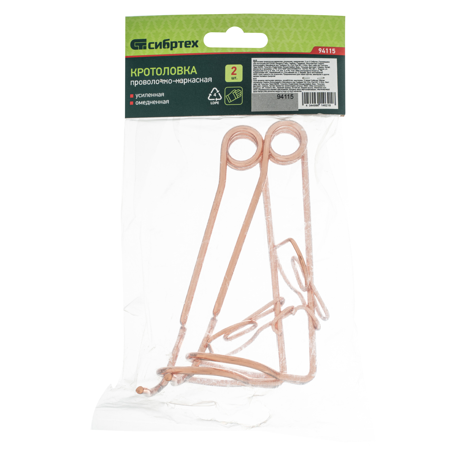 Омедненная проволочно-каркасная кротоловка Сибртех 94115 усиленной конструкции, 2 шт. в упаковке, предназначена для ловли кротов. С ее помощью можно избавиться от вредителей на дачном участке. Кротоловку легко скрыть в земле, чтобы животные ее не обнаружили. При этом она не заедает при попадании посторонних предметов.