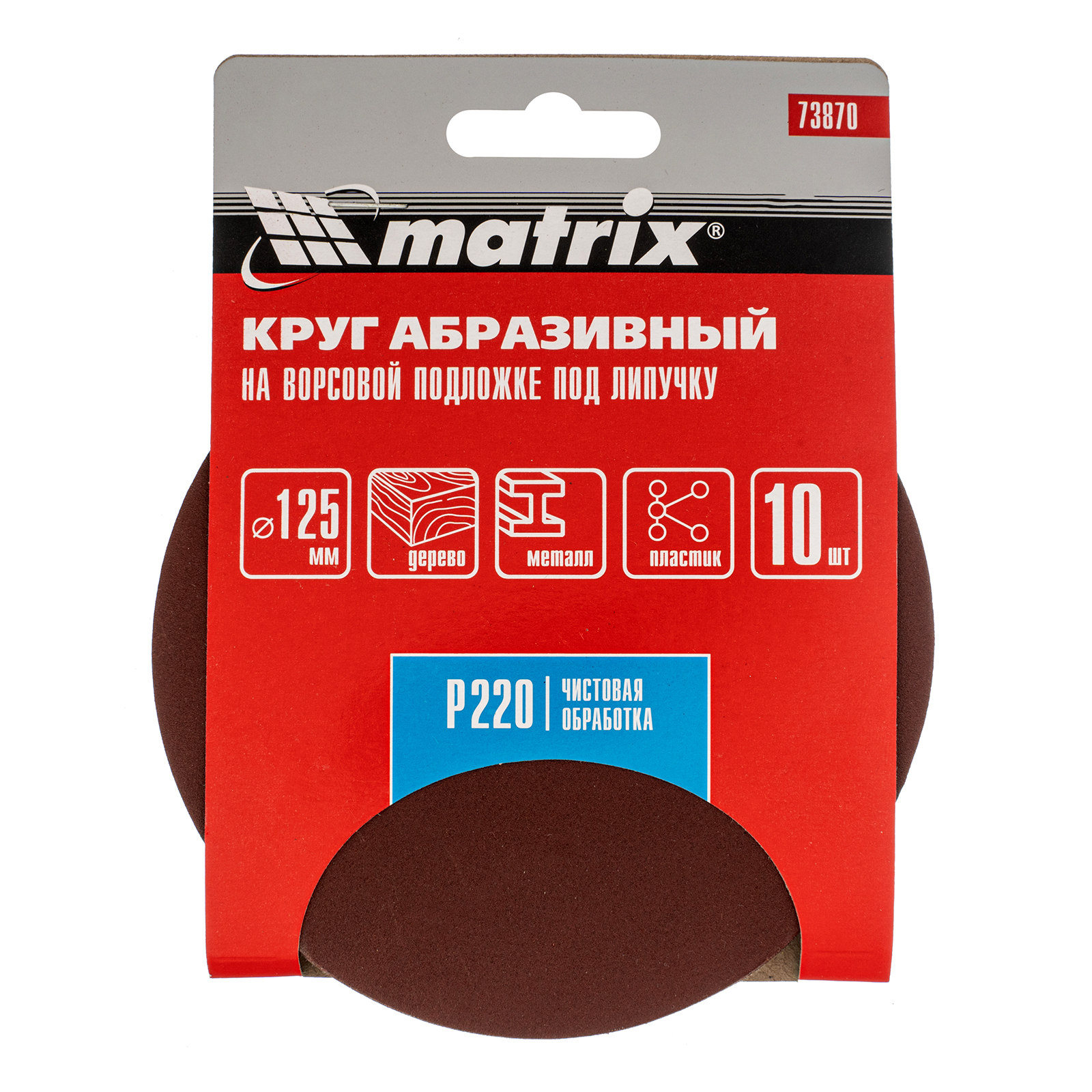 Абразивный круг на ворсовой подложке под «липучку» Matrix 73870 с зернистостью Р 220, диаметром 125 мм, используется для сухого финишного шлифования металла, древесины, пластика и других поверхностей. Круг устанавливается на эксцентриковую (орбитальную) шлифовальную машинку или на дрель с помощью опорной насадки Matrix соответствующего диаметра.