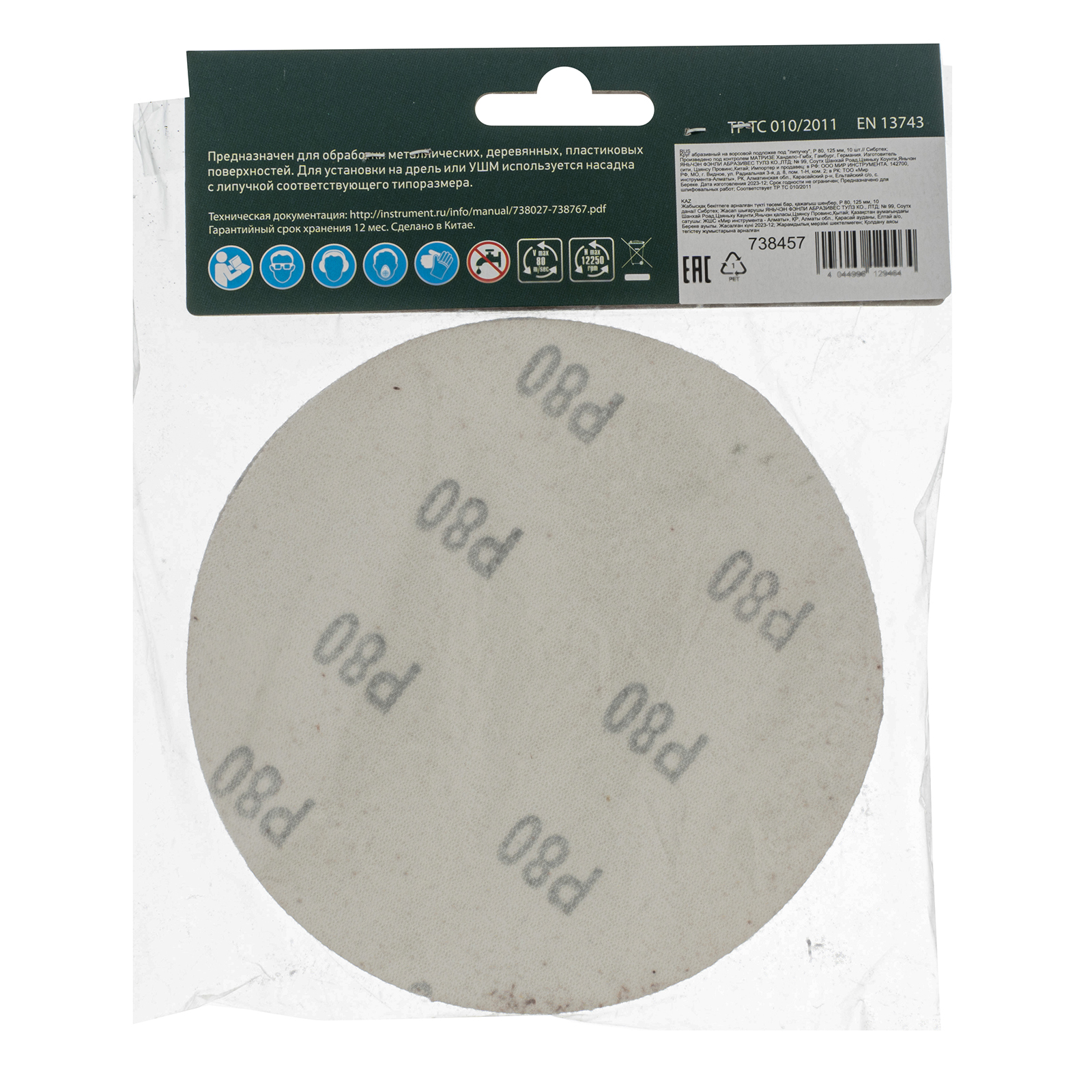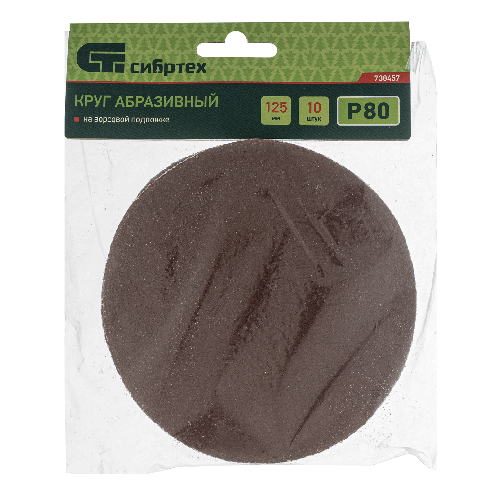 Абразивный круг на ворсовой подложке под «липучку» Сибртех 738457 с зернистостью Р 80, диаметром 125 мм, используется для сухого первичного шлифования металла, древесины, пластика и других поверхностей. Круг устанавливается на эксцентриковую (орбитальную) шлифовальную машинку или на дрель с помощью опорной насадки Сибртех соответствующего диаметра.