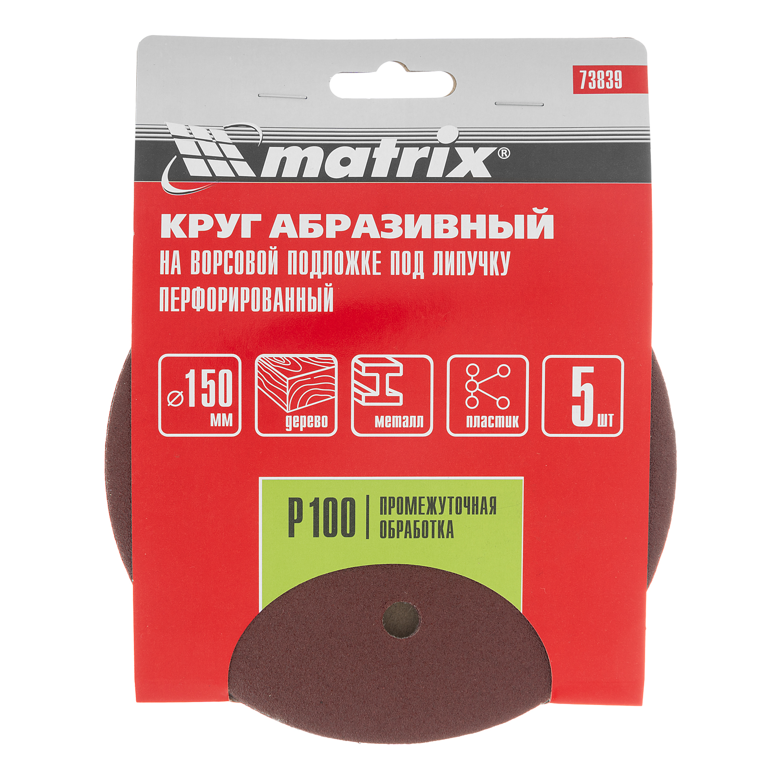 Перфорированный абразивный круг на ворсовой подложке под «липучку» Matrix 73839 с зернистостью Р 100, диаметром 150 мм, используется для промежуточного шлифования металла, древесины, пластика и других поверхностей. Круг устанавливается на эксцентриковую (орбитальную) шлифовальную машинку с возможностью отвода воздуха или на дрель с помощью опорной насадки Matrix соответствующего диаметра. Среднезернистый абразив Р 100 позволяет избавиться от заусенцев, подходит для зачистки старого покрытия (краски/лака), удаления ржавчины, снятия слоя материала.