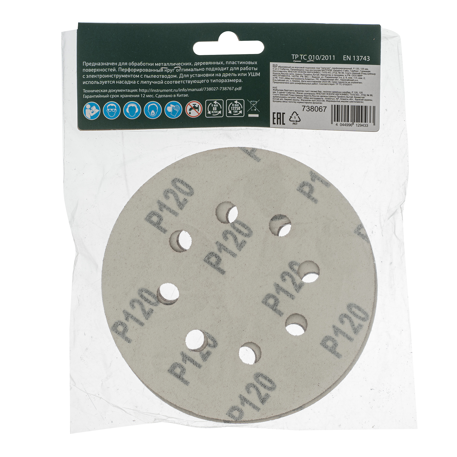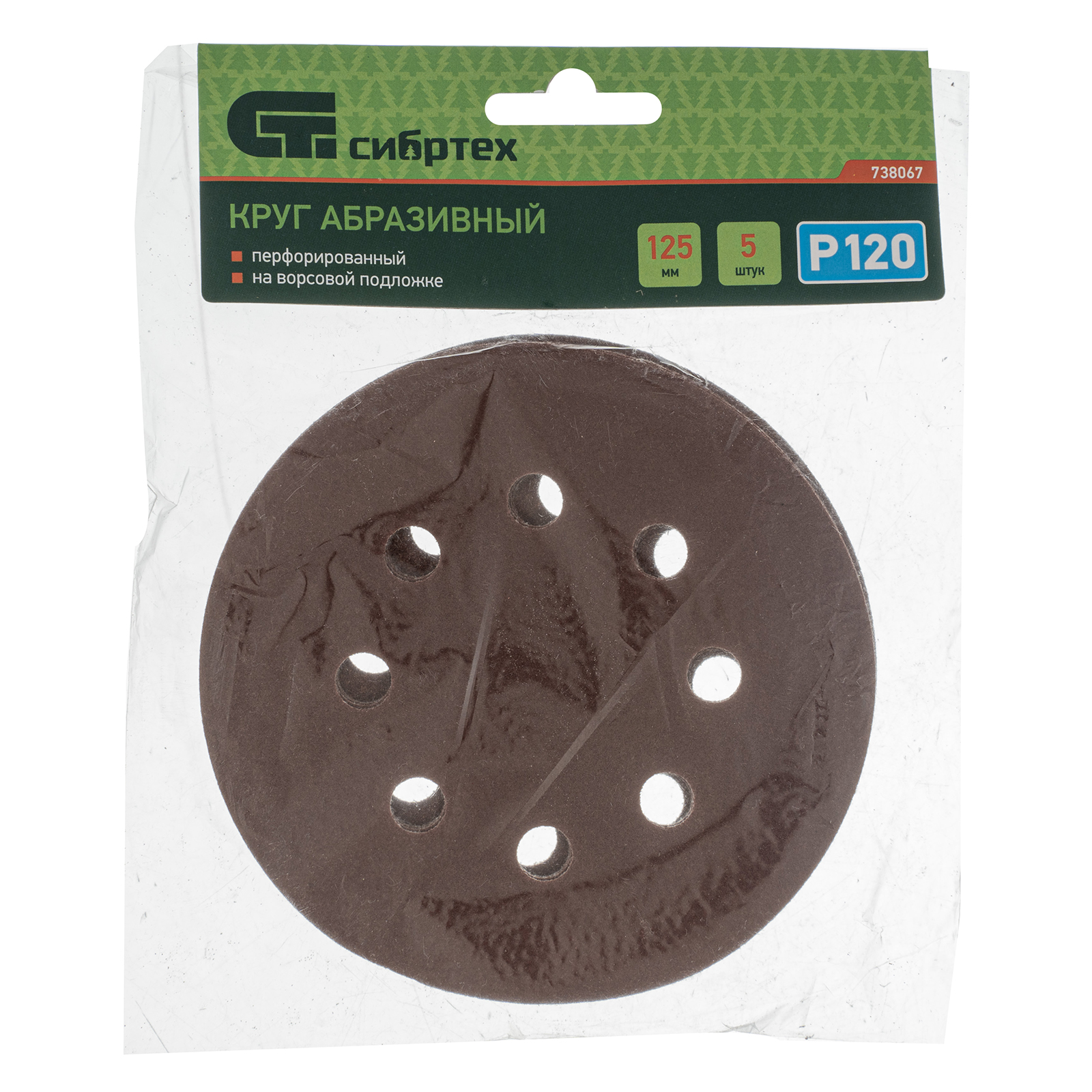 <p>Перфорированный абразивный круг Сибртех 738067 диаметром 125 мм, со среднезернистым абразивом P 120, на ворсовой подложке под «липучку», 5 шт. в упаковке, используется для сухого чистового шлифования металла, древесины, пластика и других материалов. Устраняет дефекты, придает гладкость поверхностям, подготавливая их к последующей отделке. Круг устанавливается на эксцентриковую (орбитальную) шлифовальную машинку с отводом воздуха или на дрель с помощью опорной насадки.</p><h2>Преимущества</h2><ul><li>Эффективная обработка — перфорация обеспечивает быстрый отвод отработанного материала, что особенно важно при шлифовке древесины.</li><li>Быстрая установка и замена оснастки — благодаря ворсовой подложке круг крепится к опорной тарелке на липучку за несколько секунд.</li><li>Удобная комплектация — 5 кругов хватит для выполнения большого объема работ.</li></ul>