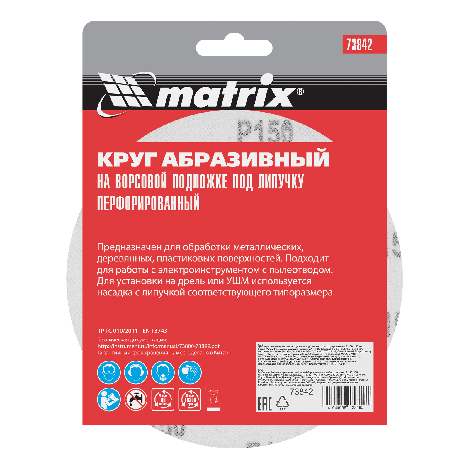 Перфорированный абразивный круг на ворсовой подложке под «липучку» Matrix 73842 с зернистостью Р 150, диаметром 150 мм, используется для сухого чистового шлифования металла, древесины, пластика и других поверхностей. Круг устанавливается на эксцентриковую (орбитальную) шлифовальную машинку с возможностью отвода воздуха или на дрель с помощью опорной насадки Matrix соответствующего диаметра. Среднезернистый абразив Р 150 позволяет придать поверхности гладкость для дальнейшего нанесения лака, эмали и других отделочных материалов.