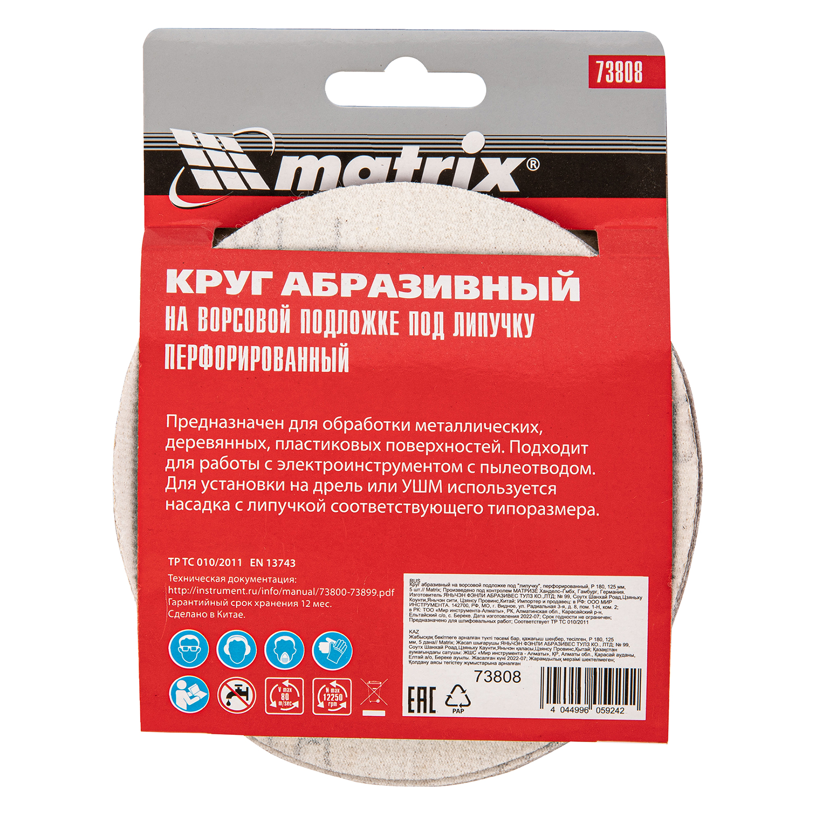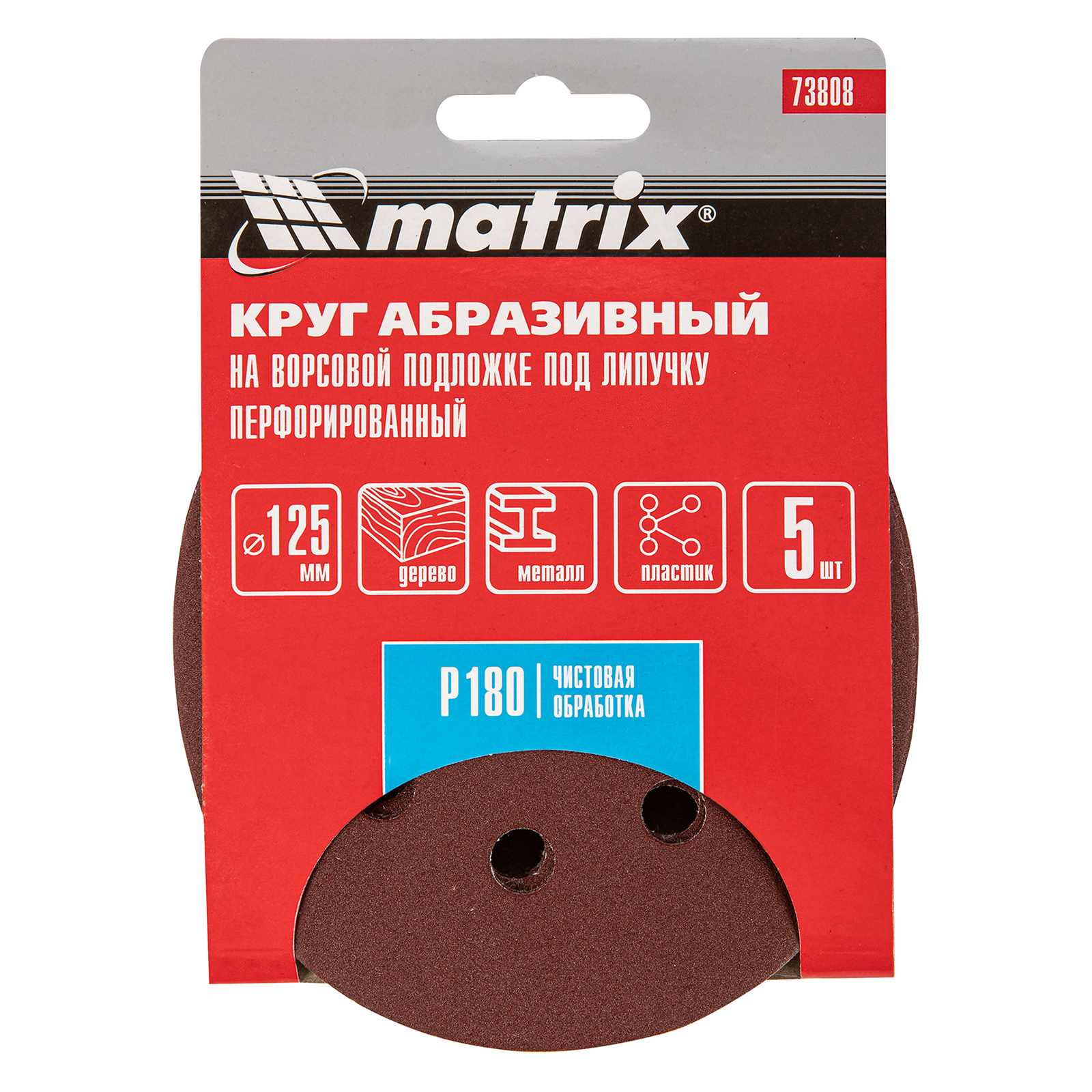 <p>Перфорированный абразивный круг Matrix 73808 диаметром 125 мм, с абразивом P 180, на ворсовой подложке под «липучку», 5 шт. в упаковке, используется для сухого чистового шлифования металла, древесины, пластика и других материалов. Позволяет придать поверхности гладкость для дальнейшего нанесения лака, эмали и других покрытий. Круг устанавливается на эксцентриковую (орбитальную) шлифовальную машинку с отводом воздуха или на дрель с помощью опорной насадки Matrix.</p><h2>Преимущества</h2><ul><li>Эффективная обработка — перфорация обеспечивает быстрый отвод отработанного материала, что особенно важно при шлифовке древесины.</li><li>Быстрая установка и замена оснастки — благодаря ворсовой подложке круг крепится к опорной тарелке на липучку за несколько секунд.</li><li>Удобная комплектация — 5 кругов хватит для выполнения большого объема работ.</li></ul>