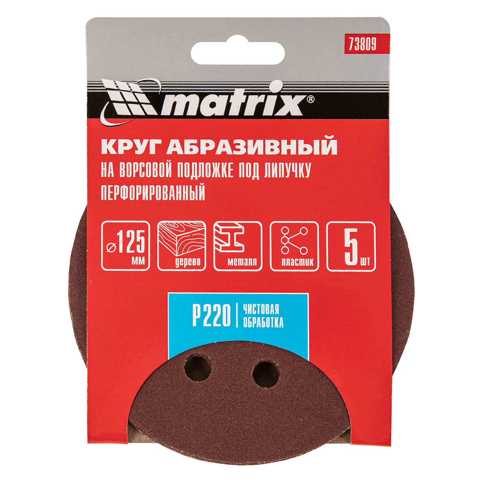 <p>Перфорированный абразивный круг Matrix 73809 диаметром 125 мм, с мелкозернистым абразивом P 220, на ворсовой подложке под «липучку», 5 шт. в упаковке, используется для сухого финишного шлифования металла, древесины, пластика и других материалов. Позволяет получить гладкую поверхность, подготовить ее к покраске. Круг устанавливается на эксцентриковую (орбитальную) шлифовальную машинку с отводом воздуха или на дрель с помощью опорной насадки Matrix.</p><h2>Преимущества</h2><ul><li>Эффективная обработка — перфорация обеспечивает быстрый отвод отработанного материала, что особенно важно при шлифовке древесины.</li><li>Быстрая установка и замена оснастки — благодаря ворсовой подложке круг крепится к опорной тарелке на липучку за несколько секунд.</li><li>Удобная комплектация — 5 кругов хватит для выполнения большого объема работ.</li></ul>