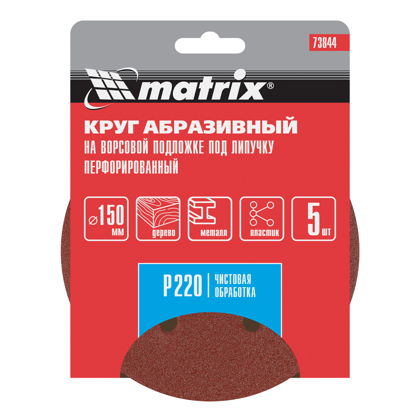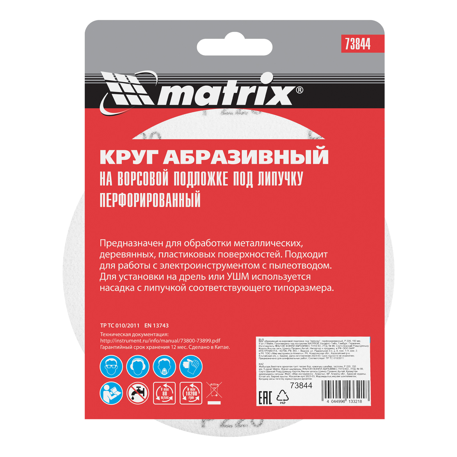 Перфорированный абразивный круг на ворсовой подложке под «липучку» Matrix 73844 с зернистостью Р 220, диаметром 150 мм, используется для сухого финишного шлифования металла, древесины, пластика и других поверхностей. Круг устанавливается на эксцентриковую (орбитальную) шлифовальную машинку с возможностью отвода воздуха или на дрель с помощью опорной насадки Matrix соответствующего диаметра. Мелкозернистый абразив Р 220 позволяет получить гладкую поверхность и подготовить ее к покраске.