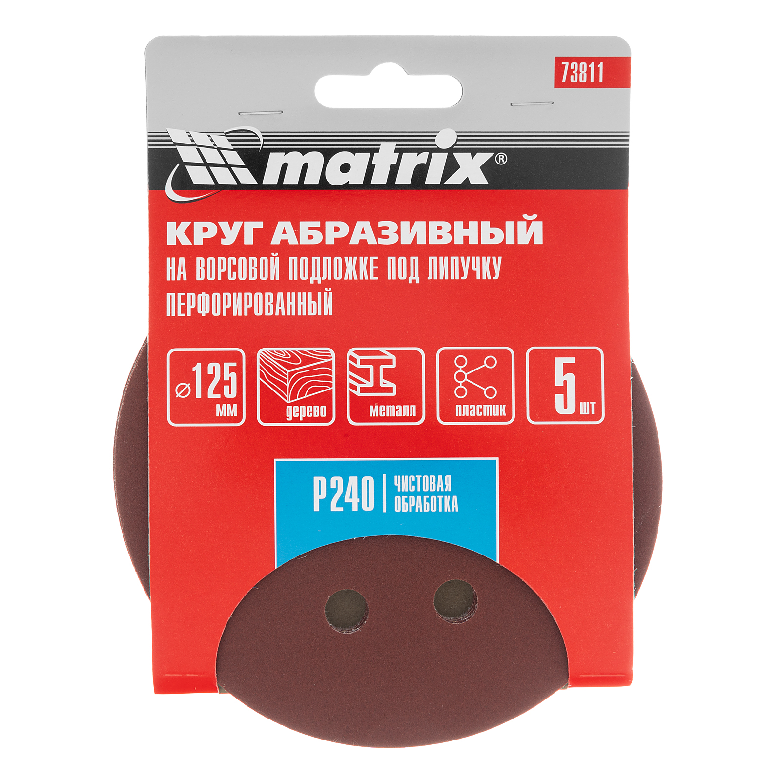 Перфорированный абразивный круг Matrix 73811 диаметром 125 мм, с мелкозернистым абразивом P 240, на ворсовой подложке под «липучку», 5 шт. в упаковке, используется для сухого финишного шлифования металла, древесины, пластика и других материалов. Позволяет устранить мелкие недостатки перед окрашиванием. Круг устанавливается на эксцентриковую (орбитальную) шлифовальную машинку с отводом воздуха или на дрель с помощью опорной насадки Matrix.