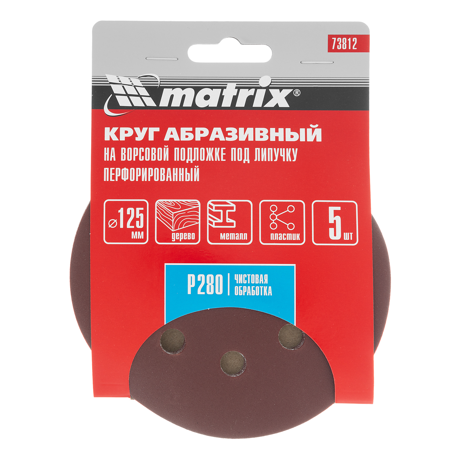 <p>Перфорированный абразивный круг Matrix 73812 диаметром 125 мм, с мелкозернистым абразивом P 280, на ворсовой подложке под «липучку», 5 шт. в упаковке, используется для сухого финишного шлифования металла, древесины, пластика и других материалов. Позволяет придать поверхности гладкость для нанесения краски, лака и других покрытий. Круг устанавливается на эксцентриковую (орбитальную) шлифовальную машинку с отводом воздуха или на дрель с помощью опорной насадки Matrix.</p><h2>Преимущества</h2><ul><li>Эффективная обработка — перфорация обеспечивает быстрый отвод отработанного материала, что особенно важно при шлифовке древесины.</li><li>Быстрая установка и замена оснастки — благодаря ворсовой подложке круг крепится к опорной тарелке на липучку за несколько секунд.</li><li>Удобная комплектация — 5 кругов хватит для выполнения большого объема работ.</li></ul>