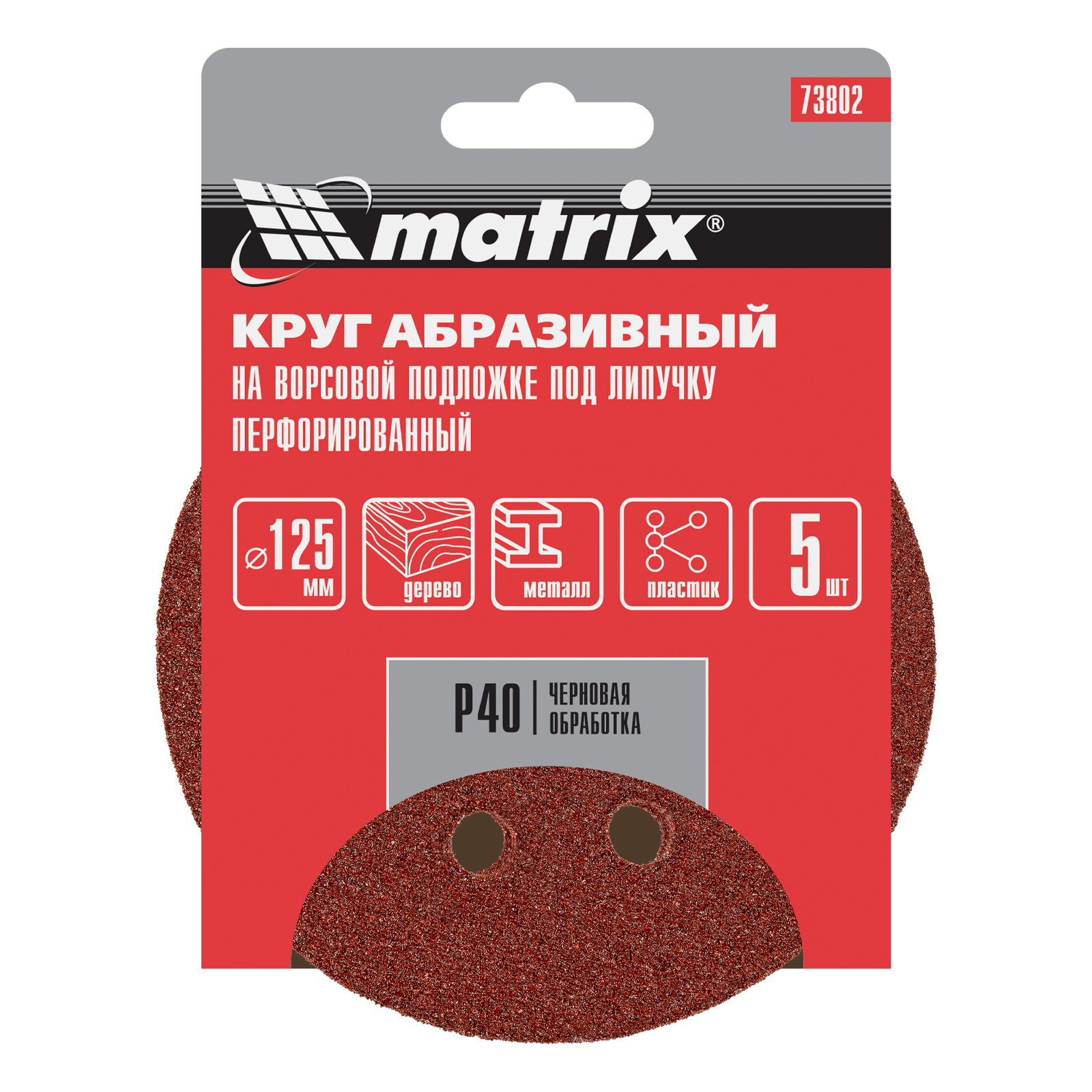<p>Перфорированный абразивный круг Matrix 73802 диаметром 125 мм, с крупнозернистым абразивом P 40, на ворсовой подложке под «липучку», 5 шт. в упаковке, используется для сухого чернового шлифования металла, древесины, пластика и других поверхностей. Позволяет избавиться от заусенцев, подходит для зачистки старого покрытия (краски/лака), удаления ржавчины, снятия слоя материала. Круг устанавливается на эксцентриковую (орбитальную) шлифовальную машинку с отводом воздуха или на дрель с помощью опорной насадки Matrix.</p><h2>Преимущества</h2><ul><li>Эффективная обработка — перфорация обеспечивает быстрый отвод отработанного материала, что особенно важно при шлифовке древесины.</li><li>Быстрая установка и замена оснастки — благодаря ворсовой подложке круг крепится к опорной тарелке на липучку за несколько секунд.</li><li>Удобная комплектация — 5 кругов хватит для выполнения большого объема работ.</li></ul>