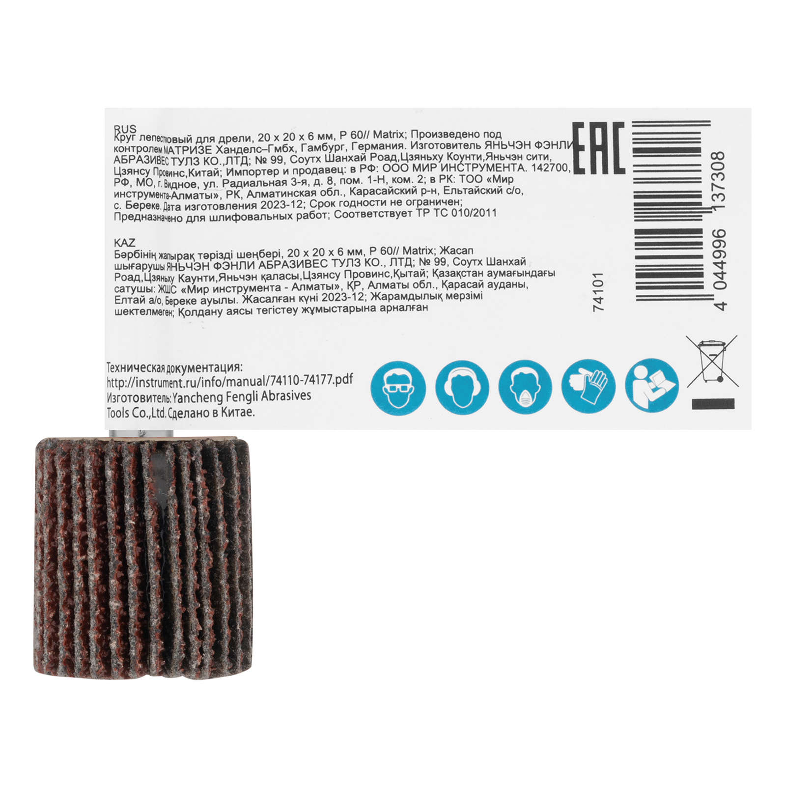 Лепестковый круг для дрели Matrix 74101 размером 20 х 20 х 6 мм, с зернистостью P 60, используется для черновой обработки металлических и деревянных поверхностей. Имеет стальной хвостовик диаметром 6 мм, при помощи которого устанавливается в патрон дрели или прямой шлифовальной машины с максимальной скоростью вращения 23900 об/мин. Крупнозернистый абразив P 60 легко удаляет слои ржавчины, краски и лака, обрабатывает сварные швы, удаляет заусенцы.