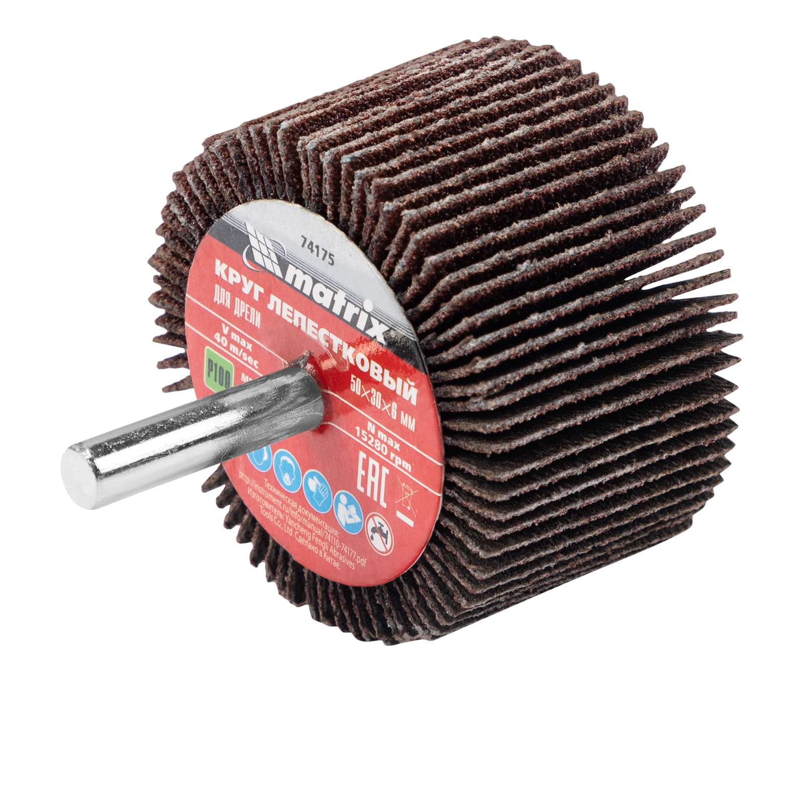 Лепестковый круг Matrix 74175 размером 50 х 30 х 6 мм, с зернистостью P 100, устанавливается в патрон дрели или прямой шлифовальной машины с посадочным диаметром 6 мм и максимальной скоростью вращения 9500 об/мин. Применяется для радиальной шлифовки внутренних и наружных поверхностей. Среднезернистый абразив P 100 успешно справляется с промежуточной обработкой металла и древесины — снятием тонкого слоя лака, краски, ржавчины и заусенцев.