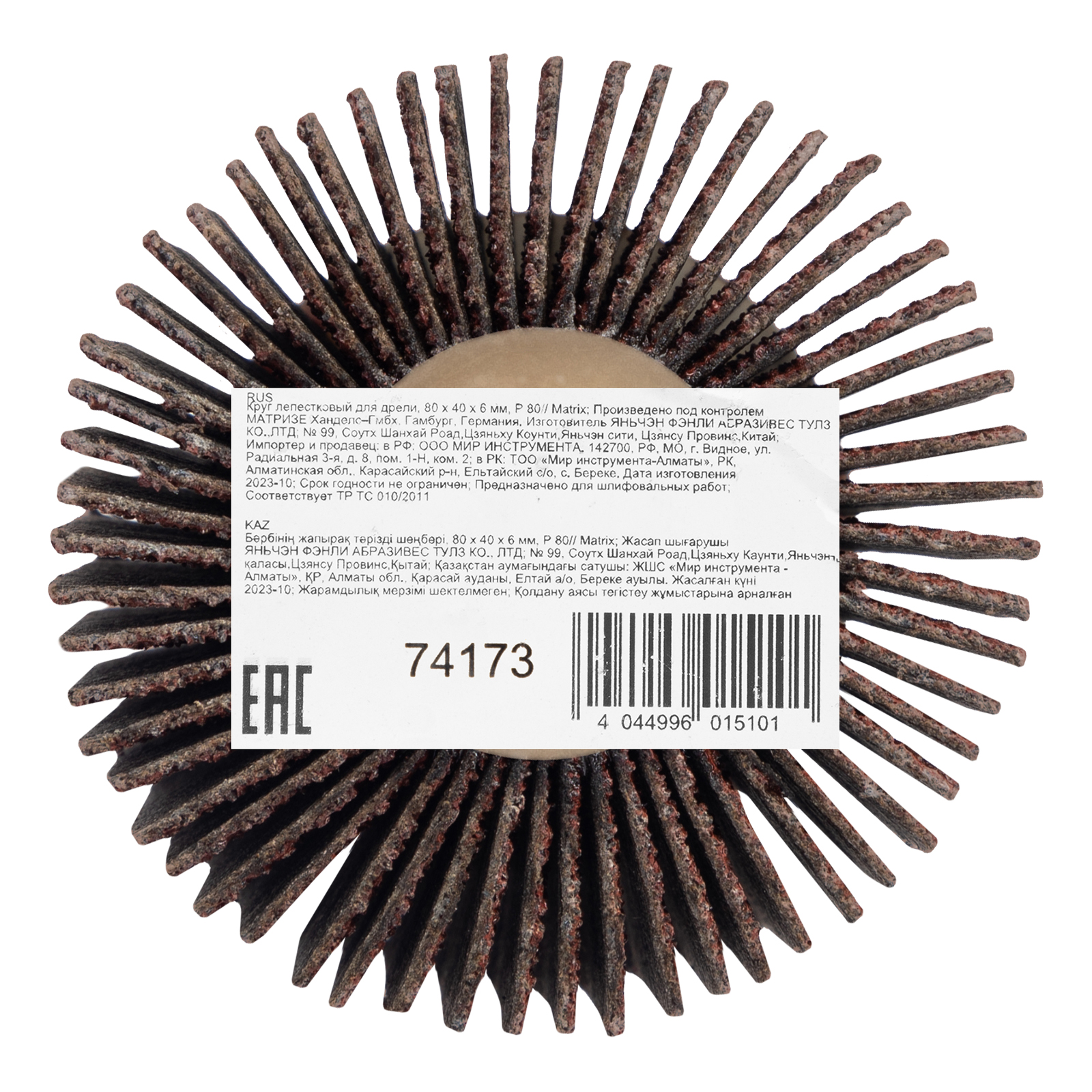Лепестковый круг для дрели Matrix 74173 размером 50 х 30 х 6 мм, с зернистостью P 60, используется для черновой обработки металлических и деревянных поверхностей. Имеет стальной хвостовик диаметром 6 мм, при помощи которого устанавливается в патрон дрели или прямой шлифовальной машины с максимальной скоростью вращения 9500 об/мин. Крупнозернистый абразив P 60 легко удаляет слои ржавчины, краски и лака, обрабатывает сварные швы, удаляет заусенцы.