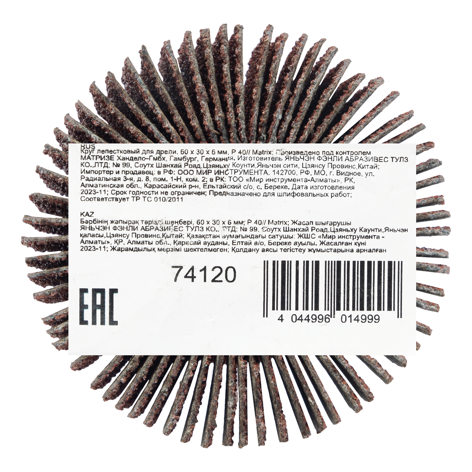 Лепестковый круг Matrix 74120 размером 60 х 30 х 6 мм, с зернистостью P 40, оснастка для дрелей и прямых шлифовальных машинок с посадочным гнездом 6 мм, рассчитанная на скорость до 8000 об/мин. Круг применяется для грубой обработки древесины, металла и других материалов. Крупнозернистый абразив P 40 эффективно снимает толстые слои краски и ржавчины, зачищает сварные швы, удаляет заусенцы.