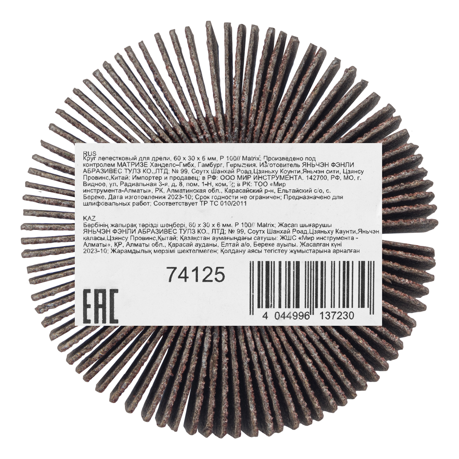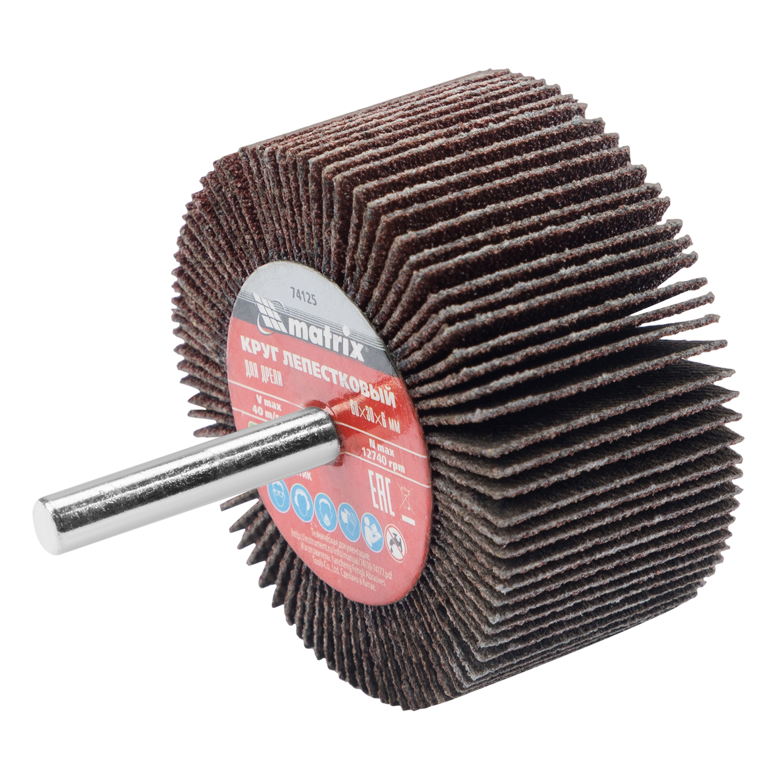 Лепестковый круг Matrix 74150 размером 80 х 40 х 6 мм, с зернистостью P 40, — оснастка для дрелей и прямых шлифовальных машинок с посадочным гнездом 6 мм, рассчитанная на скорость до 6000 об/мин. Круг применяется для грубой обработки древесины, металла и других материалов. Крупнозернистый абразив P 40 эффективно снимает толстые слои краски и ржавчины, зачищает сварные швы, удаляет заусенцы.