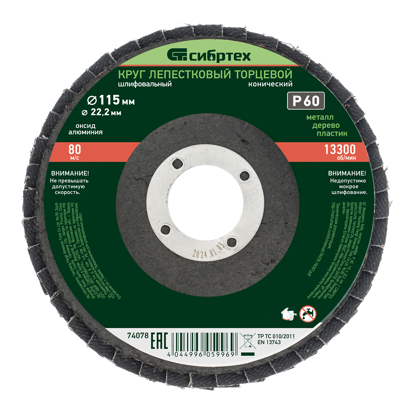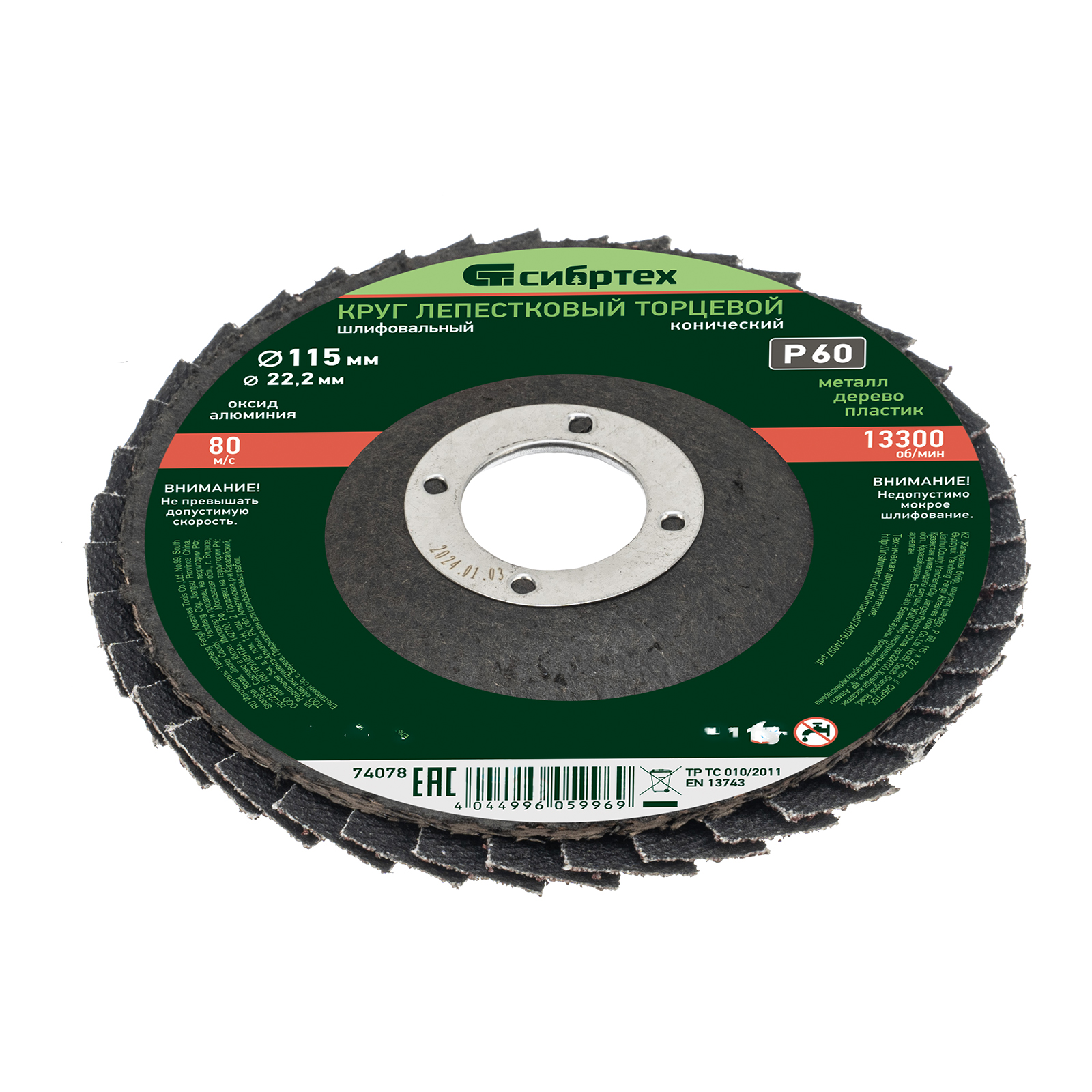 Круг лепестковый торцевой конический Сибртех 74078 с крупнозернистым абразивом Р60, 115 х 22,2 мм, устанавливается на углошлифовальные машины с соответствующим посадочным диаметром. Он используется для грубой (черновой) обработки, торцевого и плоского шлифования древесины, металла, пластика. С помощью него можно выполнить первичную зачистку сварных швов, убрать грубые дефекты, толстый слой ржавчины и краски и т.д.